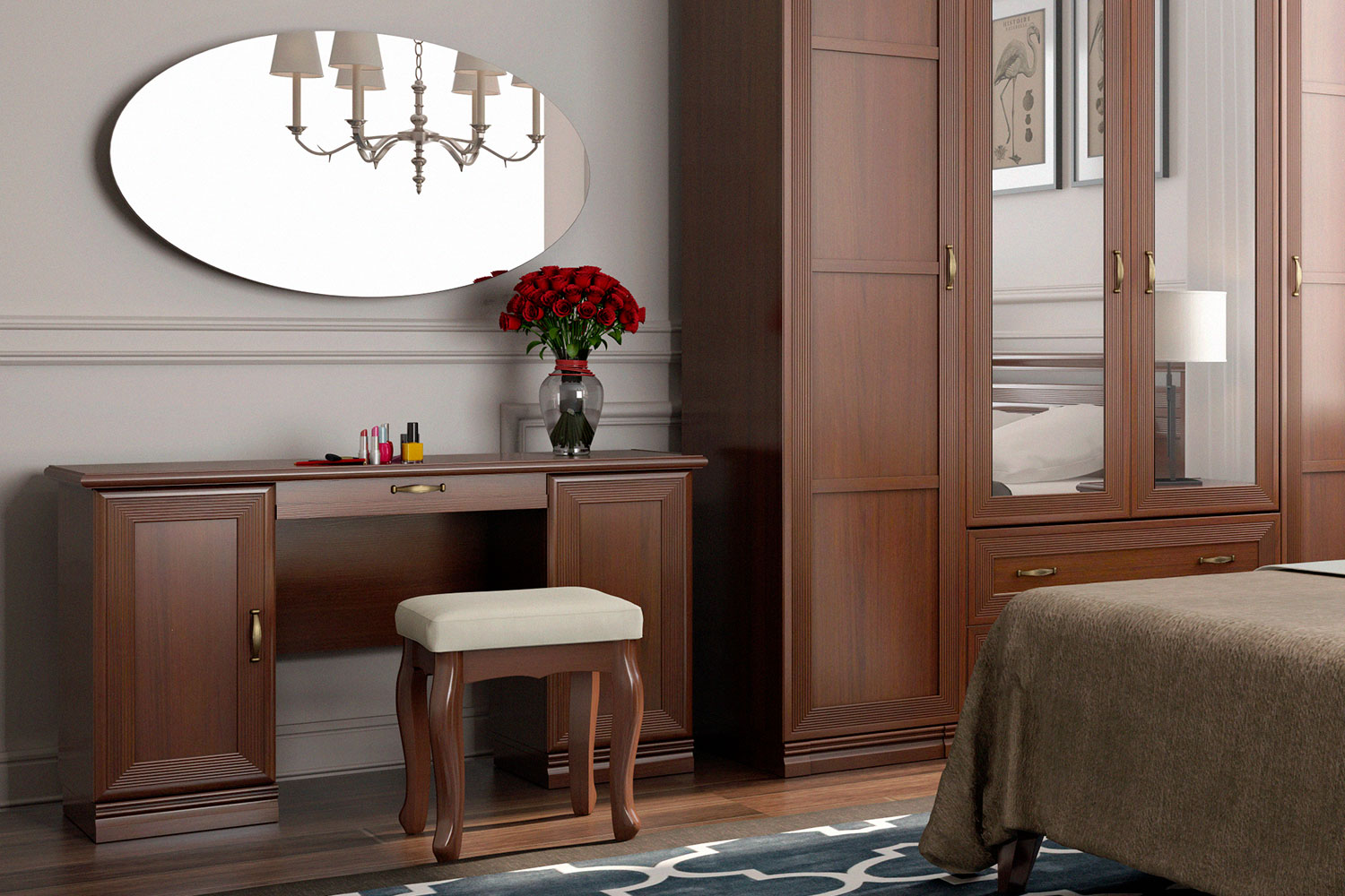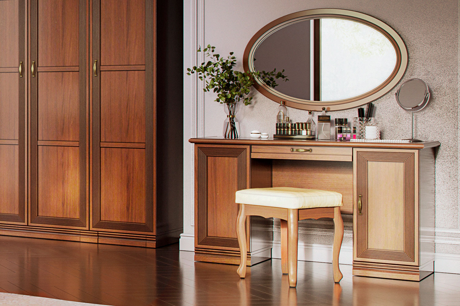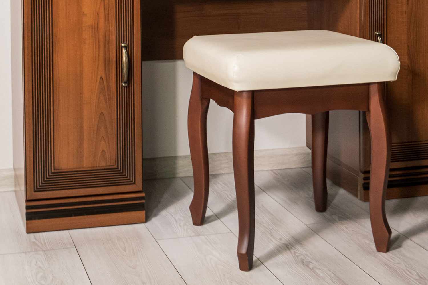 Компактная банкетка с фигурными ножками может быть использована как декоративный элемент классического интерьера, в качестве пуфа для туалетного столика, для сборов в прихожей или как дополнительное посадочное место в гостиной.