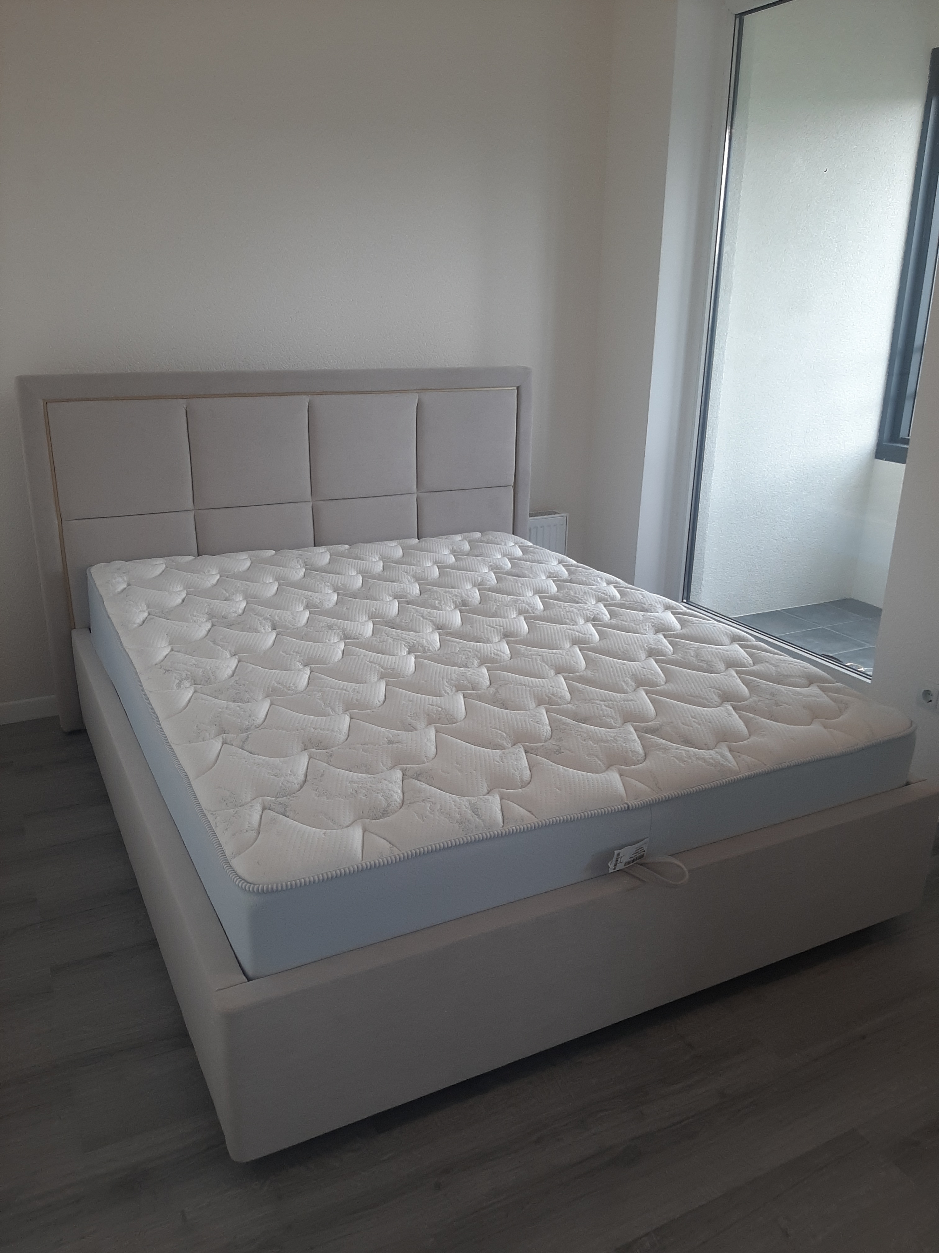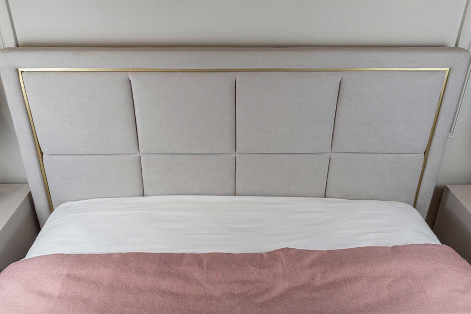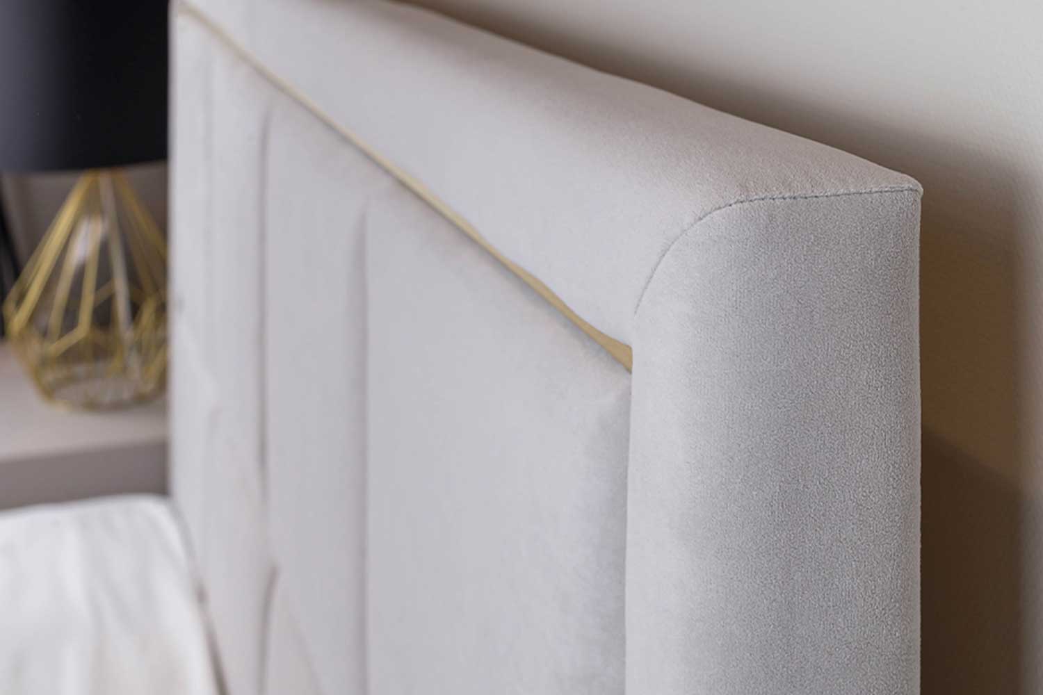 Высокое изголовье с простеганной обивкой украшено по периметру тончайшим золотым кантом. Металлизированная окантовка великолепно гармонирует с мягким микровелюром элегантного оттенка «серый кашемир». Материал отличается износостойкостью и приятной на ощупь бархатистой поверхностью. Плавно закругленные углы и ножки цилиндрической формы придают мебели завершенный и изящный вид. Конструкция оснащена подъемным механизмом, скрывающим вместительный отсек для хранения постельного белья. Основание из прочной стальной рамы и упругих гнутоклееных ламелей обеспечивает ортопедические свойства изделия.