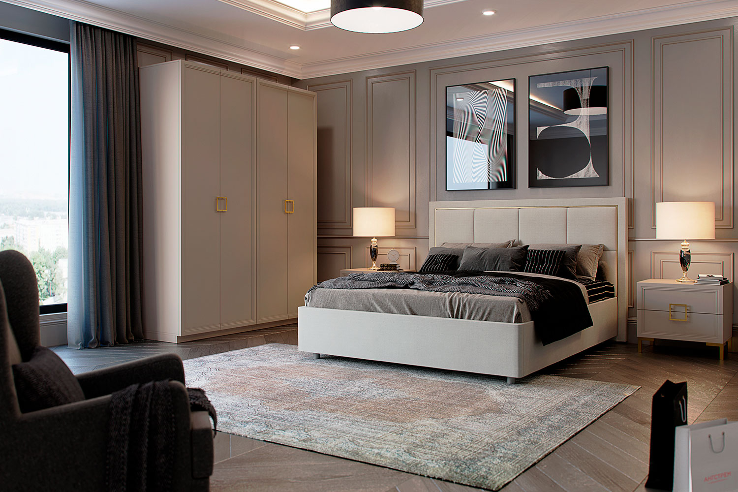 Двуспальная модель «Дольче» — это легкая роскошь, четкие линии и изысканность текстильного декора. Классический лаконичный дизайн хорошо впишется в спальню в стиле минимализм, эклектика и ар-деко.