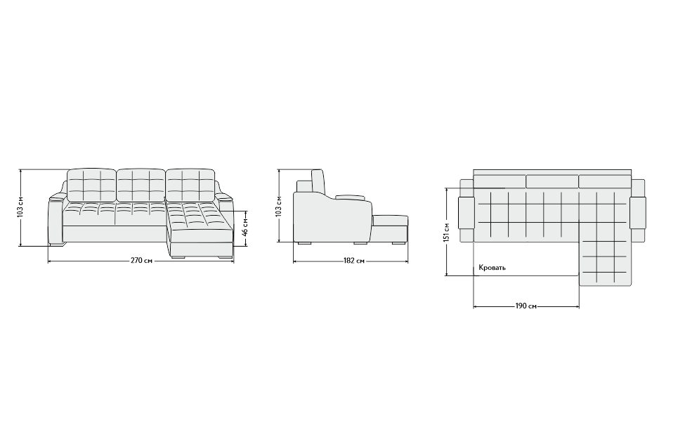 – описание: материал обивки велюр, размер спального места 151 х 190 см, стиль современный, размер 103x270x182 см.