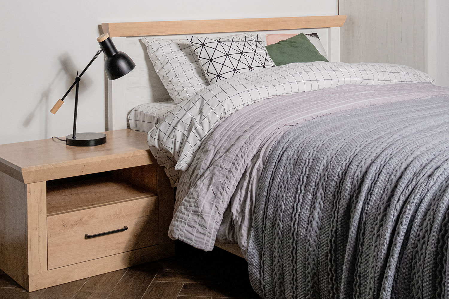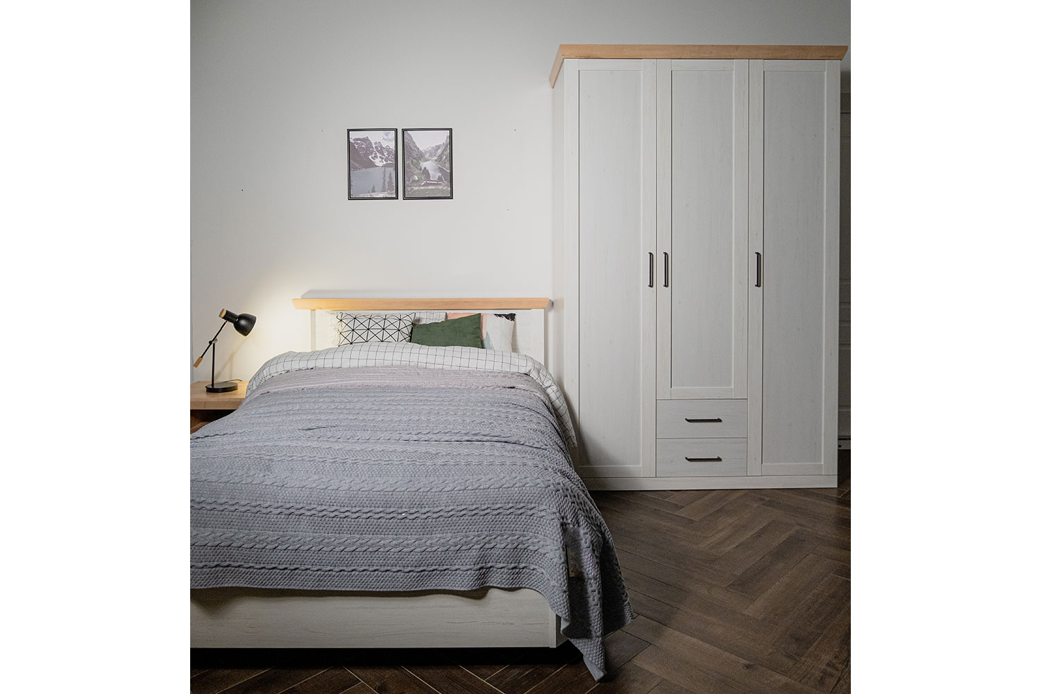 Односпальная кровать 120 х 200 см с корпусом, окрашенным в благородный оттенок блан-шене, будет отлично смотреться в интерьере спальни в стиле классика, облегченный лофт, сканди или фьюжн. Сочетание базового белого тона с теплой древесной текстурой создает атмосферу покоя и уюта, а декор в цвет дерева «дуб бунратти» разбавляет однородные поверхности.