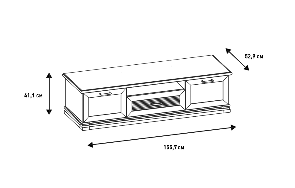 - Крайние секции — выдвижные ящики, средняя секция с двумя отделениями по высоте (верхнее отделение — открытая ниша, нижнее отделение — с выдвижным ящиком);