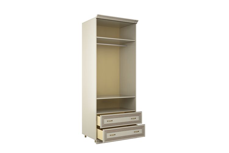 - Шкаф укомплектован полками, штангой и 2 выдвижными ящиками;