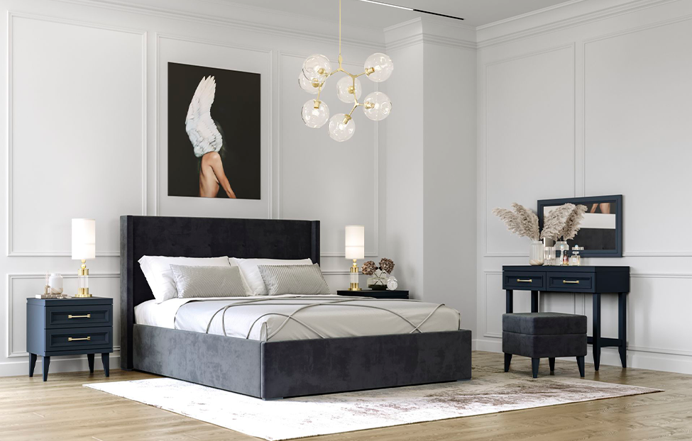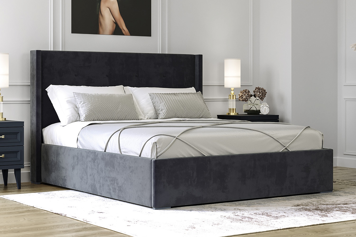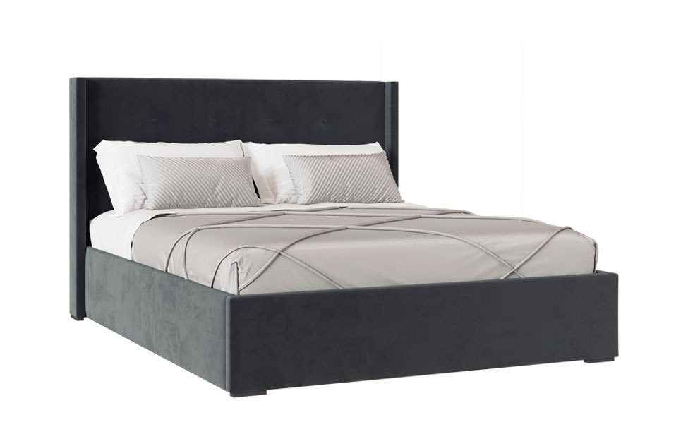 – описание: назначение для дома, для спальни, материал обивки микровелюр, стиль английский, неоклассика, цвет серый уголь.
