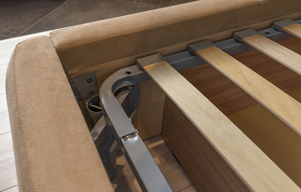 - Внутри корпуса расположен ящик для белья, к которому прикреплен механизм подъёма рамки кроватной;
