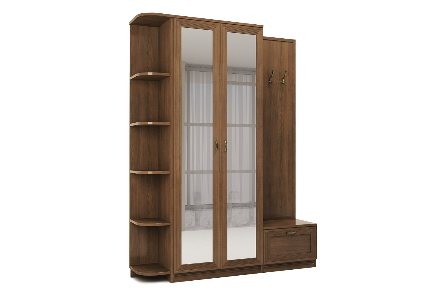 - Вместительный шкаф и вешалки позволят разместить верхнюю одежду, тумбочка сохранит в чистоте обувь, а аксессуары на стеллаже подчеркнут выбранный вами стиль интерьера.