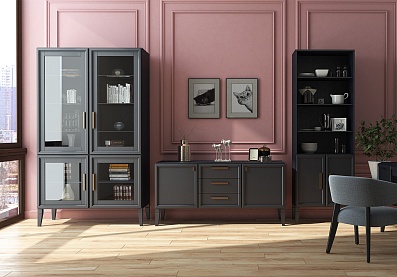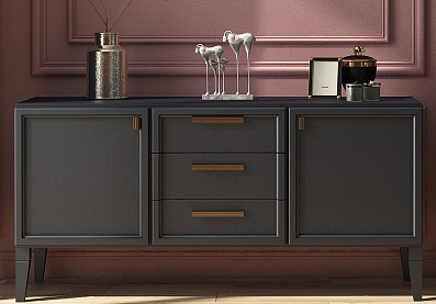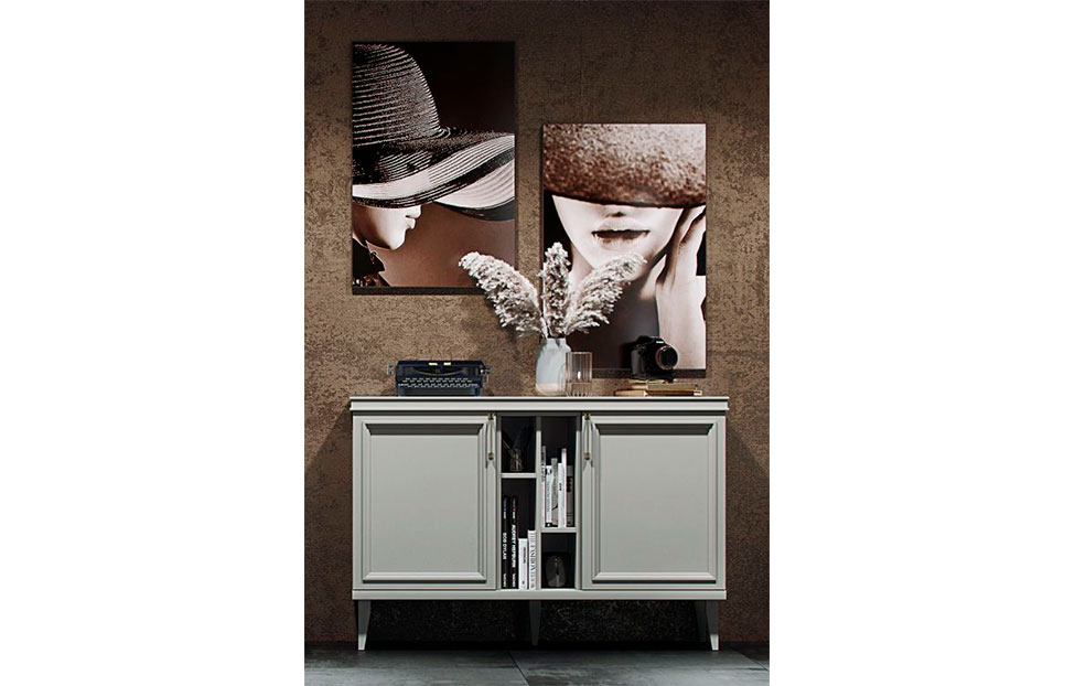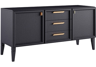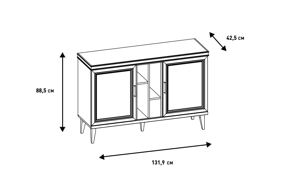 Комод включает три секции: за боковыми дверцами спрятаны съемные полки, среднее отделение состоит из асимметричных открытых отсеков. Демпферы и доводчики отвечают за плавное и беззвучное движение фасадов. Для установки требуется ровное напольное покрытие, а если мебель монтируется отдельно, ее следует дополнительно крепить к стене.