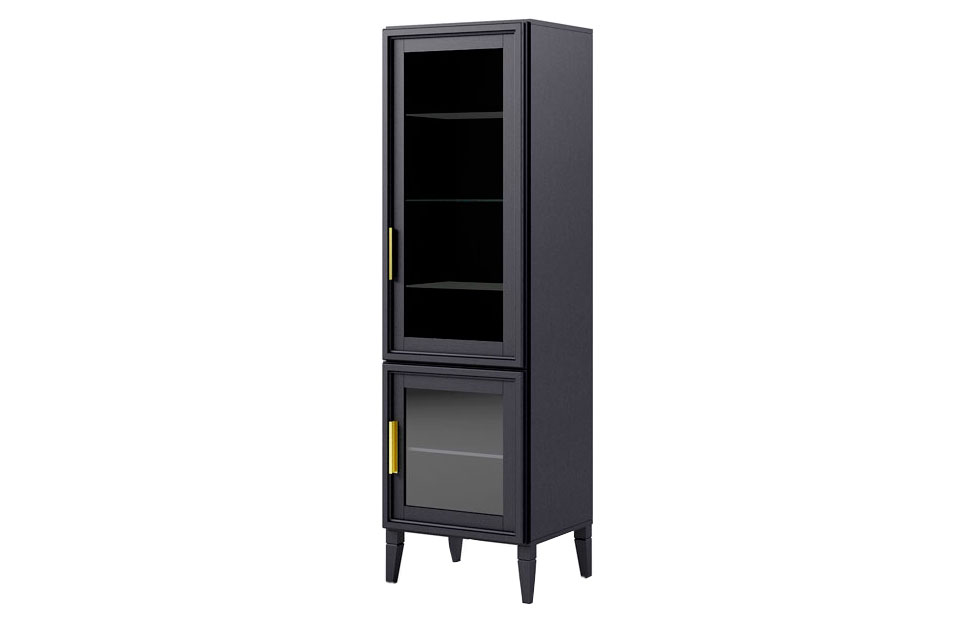- В нижней части за распашной стеклянной дверцей одно отделение со шпонированной внутренней полкой, в верхней части за распашной стеклянной дверцей отделение с тремя стеклянными полками;