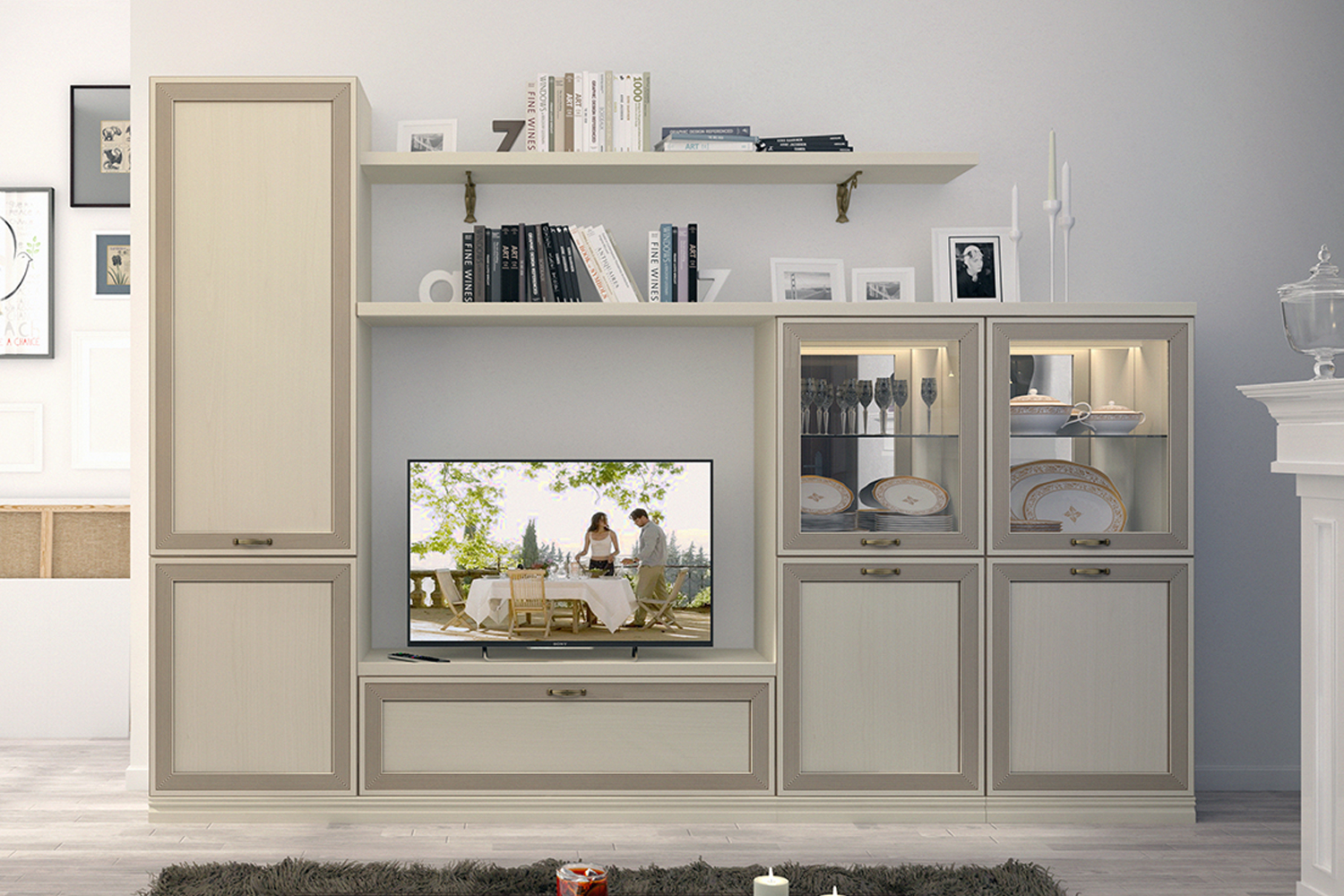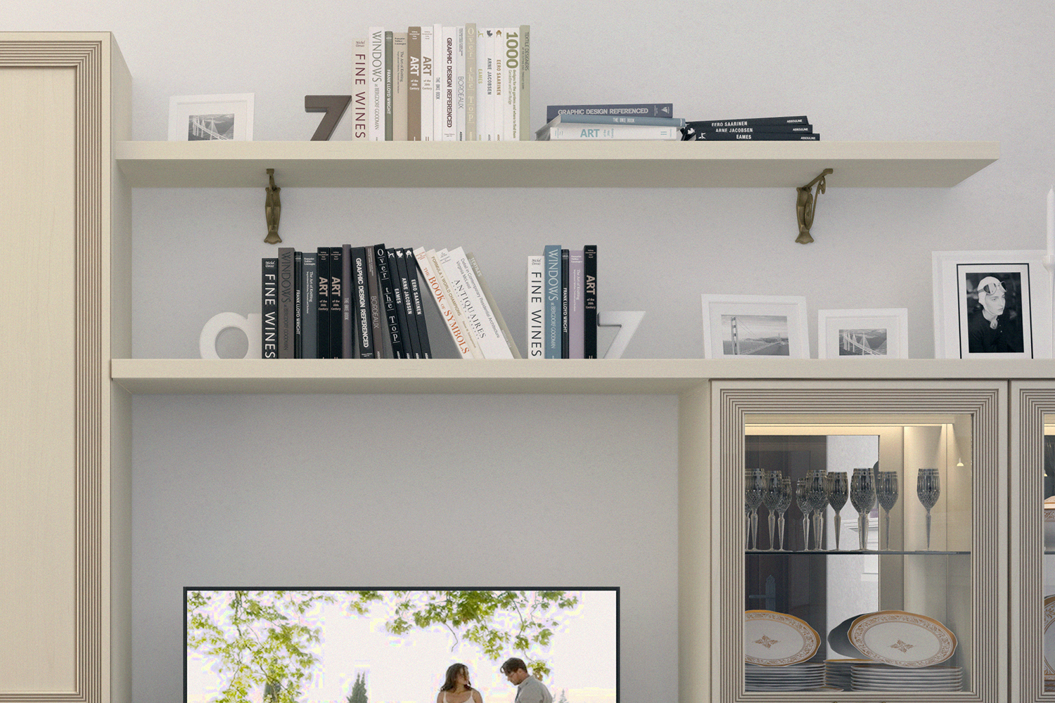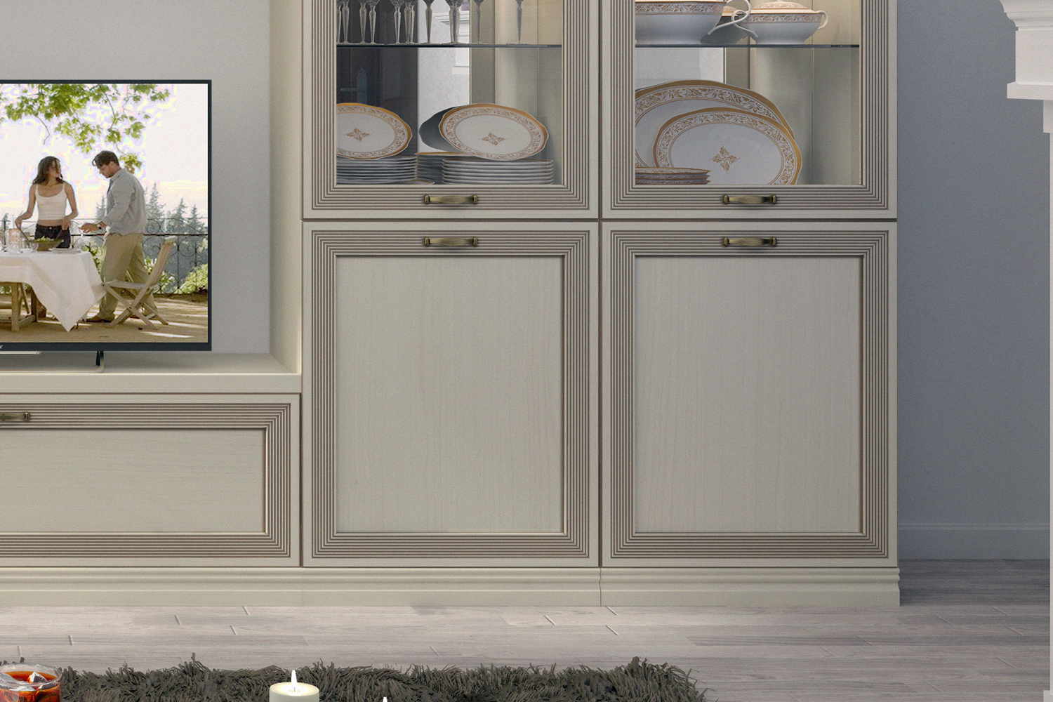 Застекленные шкафы-витрины с фрезерованными филенками позволят продемонстрировать гостям редкие издания, дорогой чайный сервиз или семейные фотографии, а LED-подсветка поможет подать ценные предметы в выгодном свете. Внутренние зеркальные стенки визуально увеличивают пространство. Изящные карнизы, стильная фурнитура в цвете «старая бронза», технология патинирования обеспечивают элегантный налет старины.