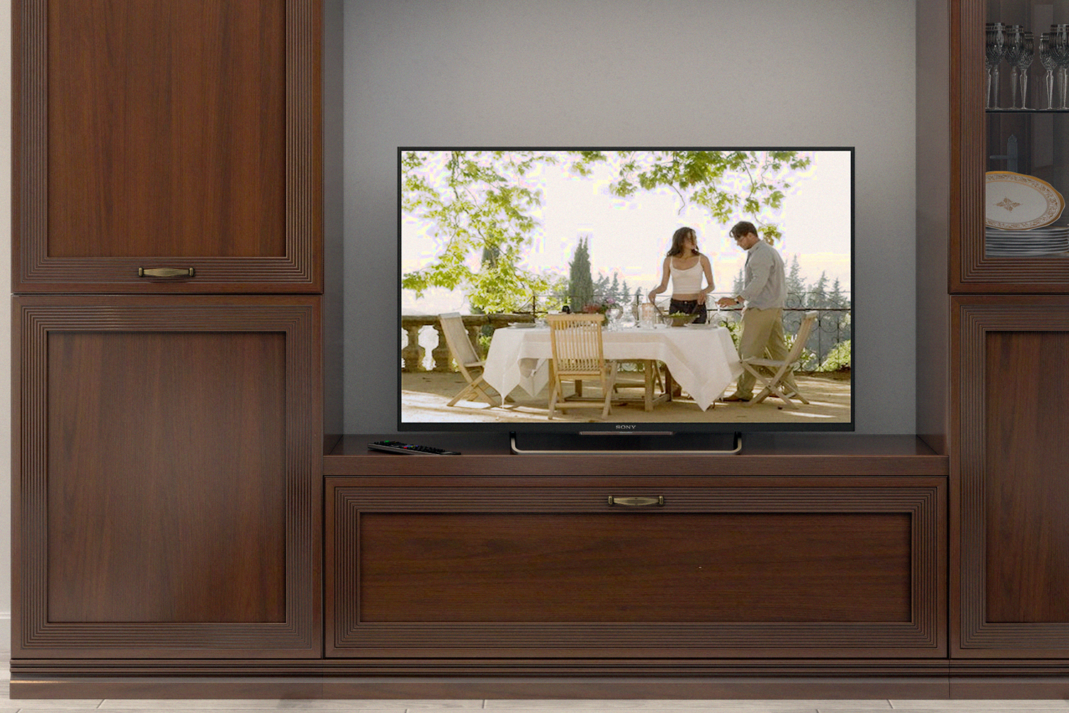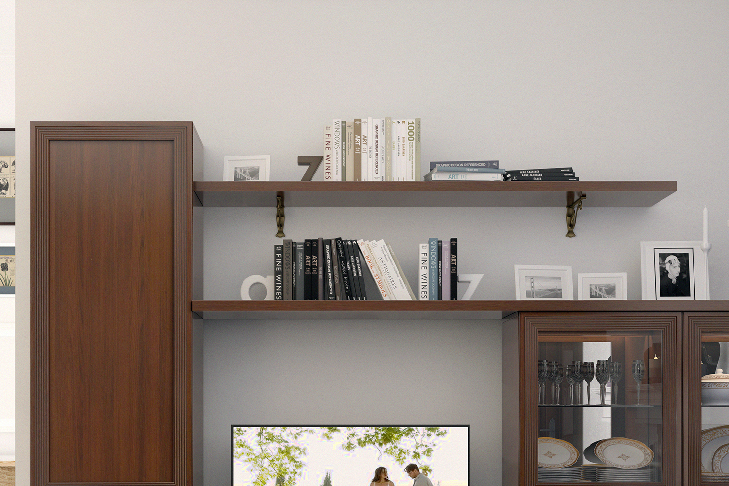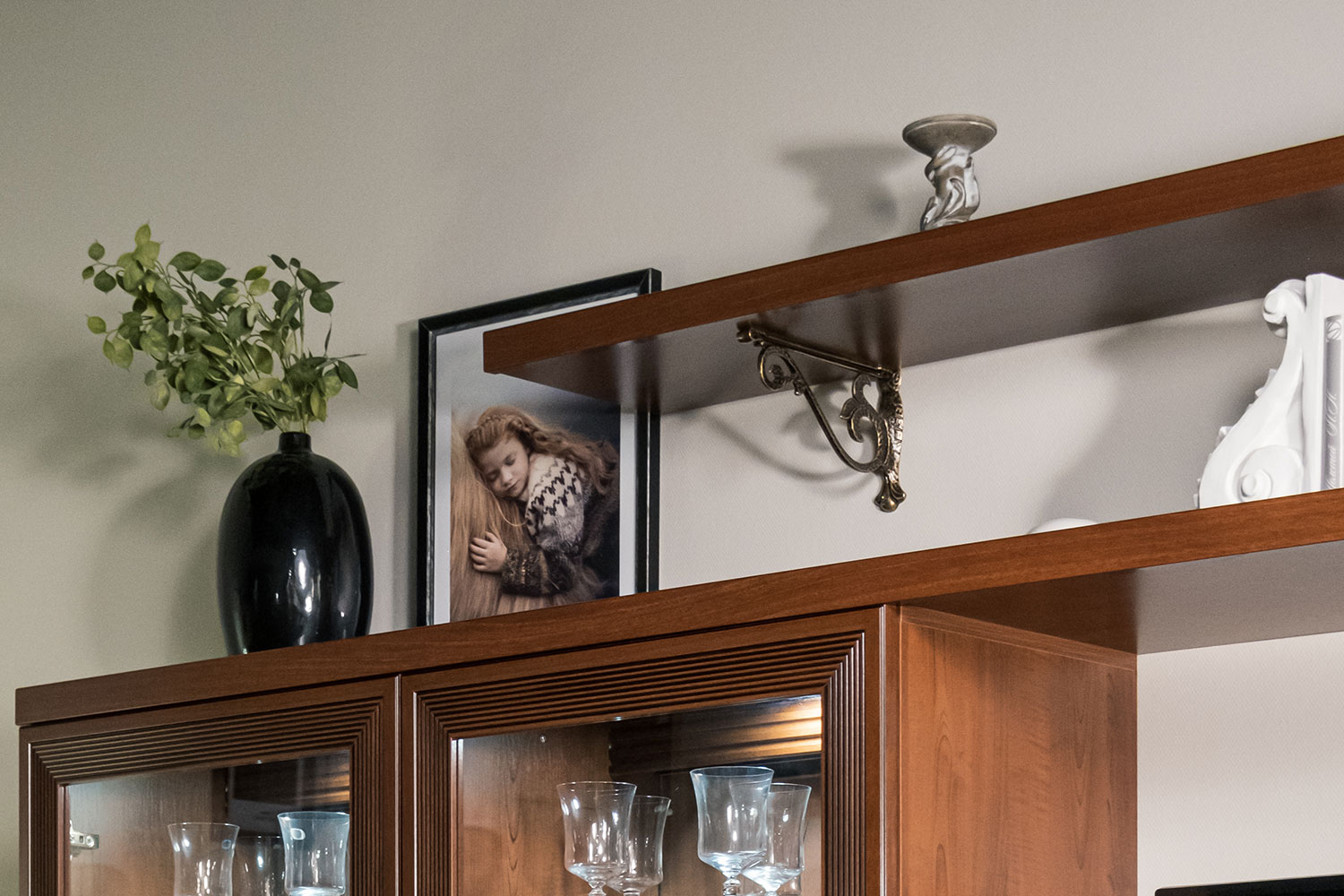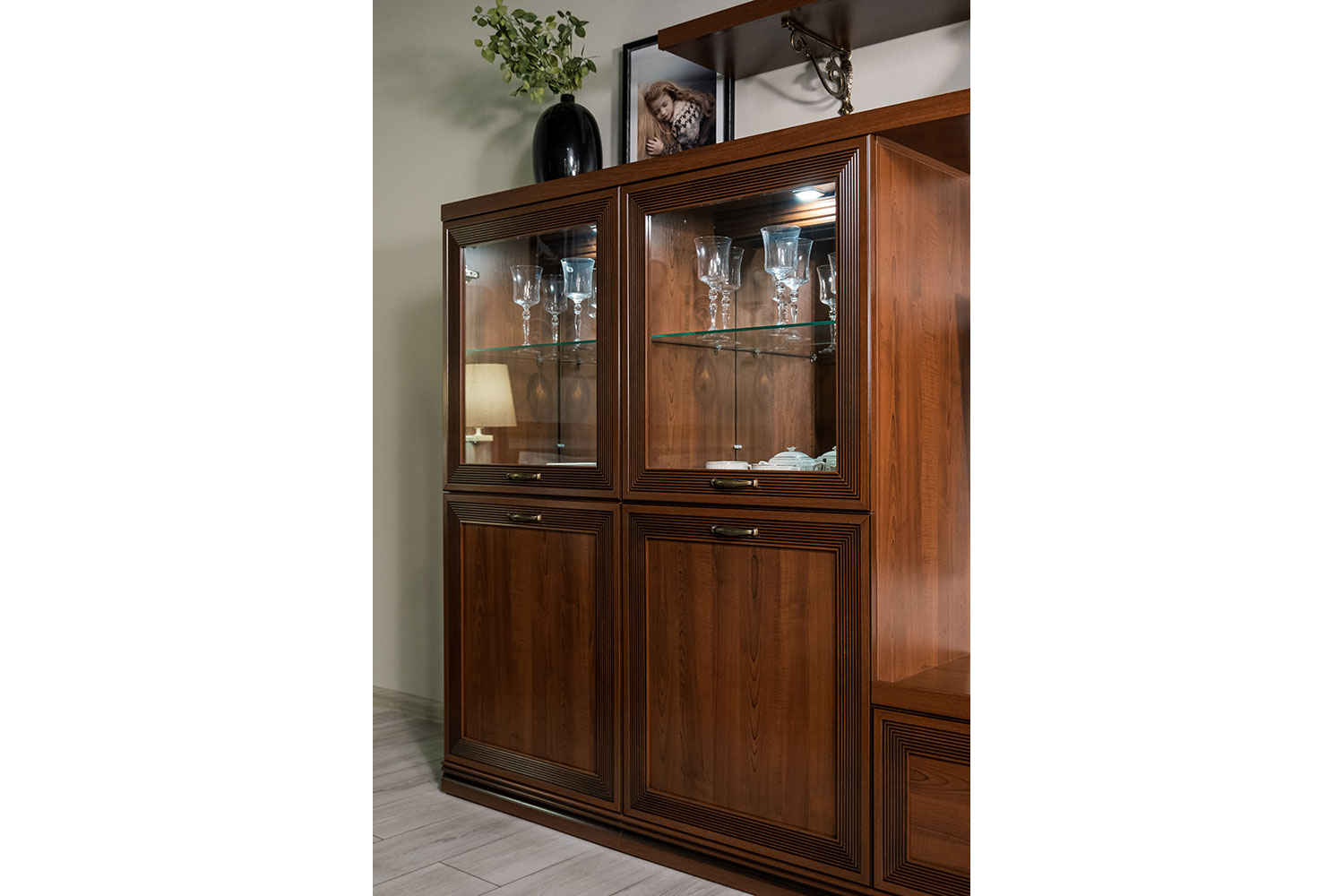 - У напольных шкафов со стеклянными вставками на задних стенках есть зеркала. Это помогает зрительно расширить комнату.