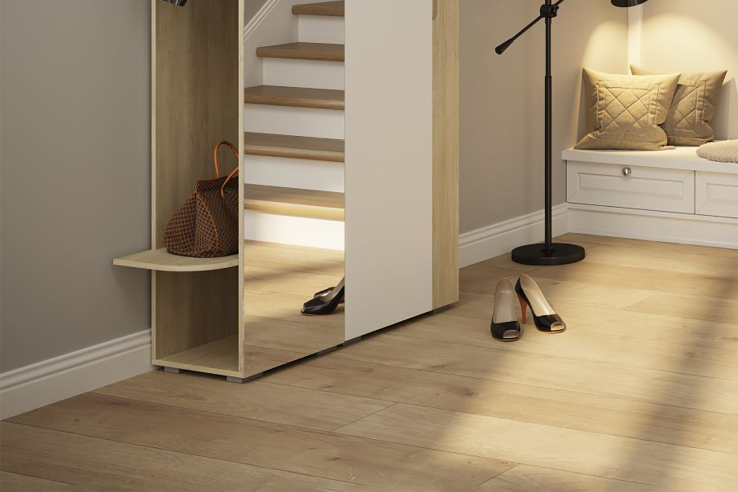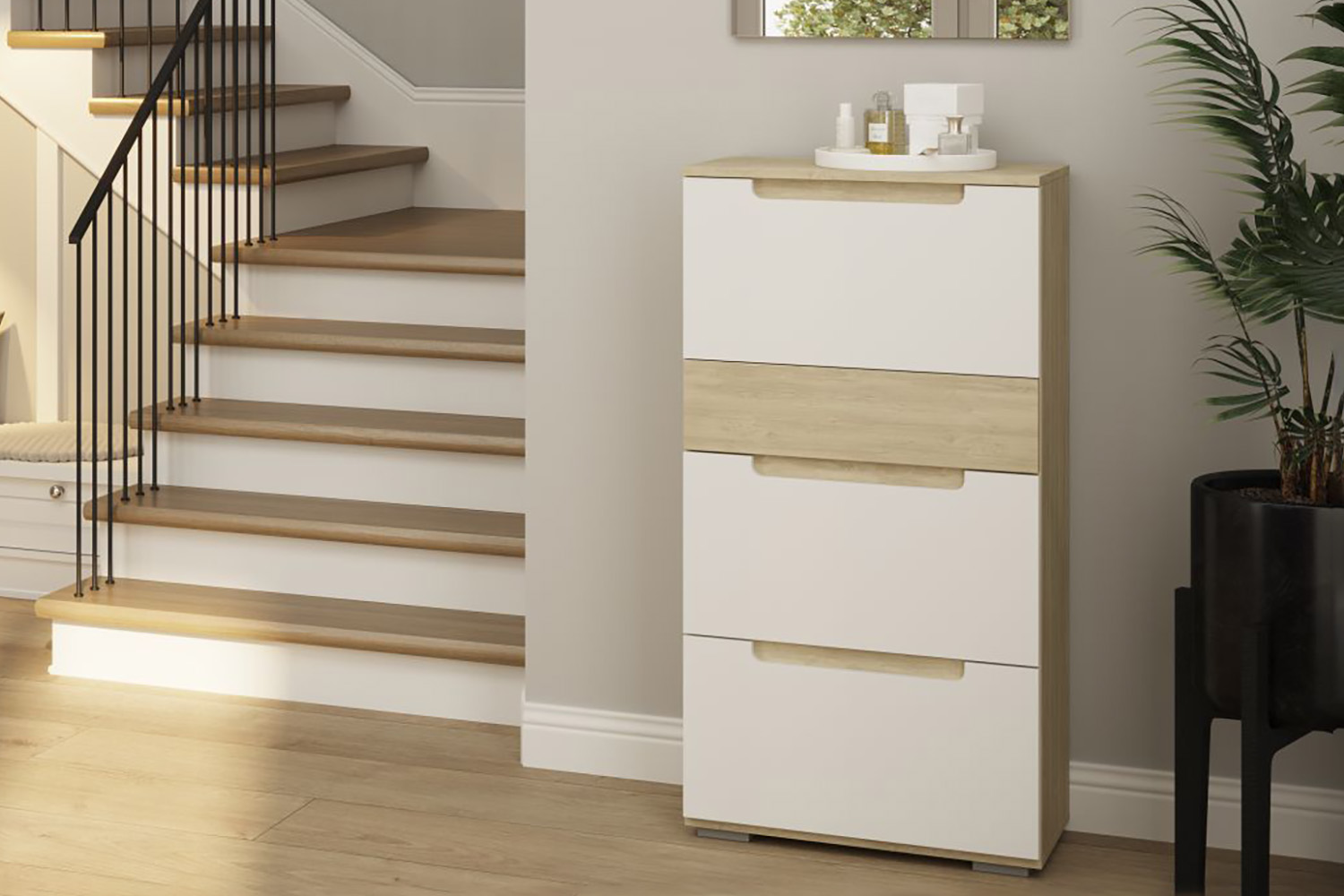 Современная и оригинальная прихожая займет почетное место в доме ценителей стиля сканди, лофт или минимализм. Светлые древесные текстуры разбавлены белыми матовыми фасадами, скрытые эргономичные ручки подчеркивают лаконичность дизайна. Необычные формы соседствуют с гладкими поверхностями.
