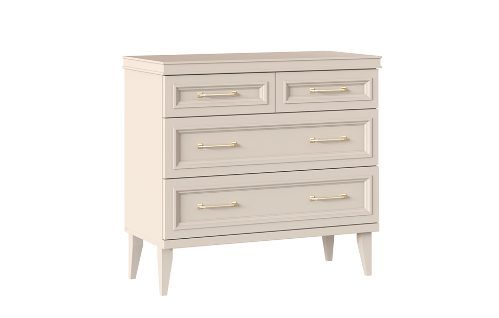 Корпус модели изготовлен из ЛДСП толщиной 16 мм, задняя стенка — из ДВП. Конструкция состоит из верхних компактных ящичков, подходящих для хранения аксессуаров, и двух нижних просторных, в которых без труда поместится текстиль или аналогичные по размеру вещи. Скрытые направляющие частичного выдвижения надежно фиксируют мебельные элементы, предотвращая их выпадение, и вместе с тем отвечают за бесшумное движение деталей.