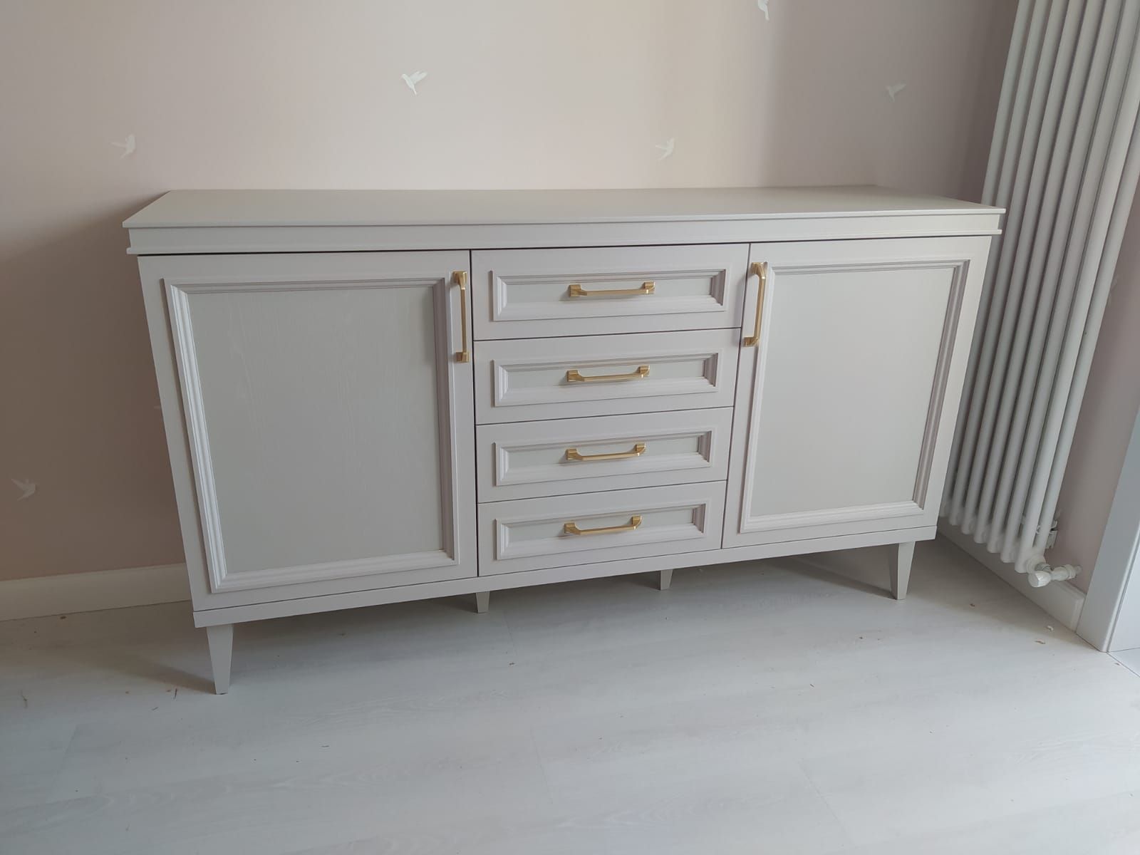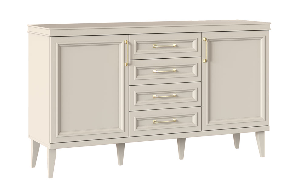 Комод состоит из трех основных секций — двух распашных боковых и центрального с четырьмя ящиками. Максимально возможная нагрузка для ящиков составляет 7 килограммов, при этом груз необходимо распределять равномерно. За боковыми фасадами скрываются полки из ламинированной ДСП.
