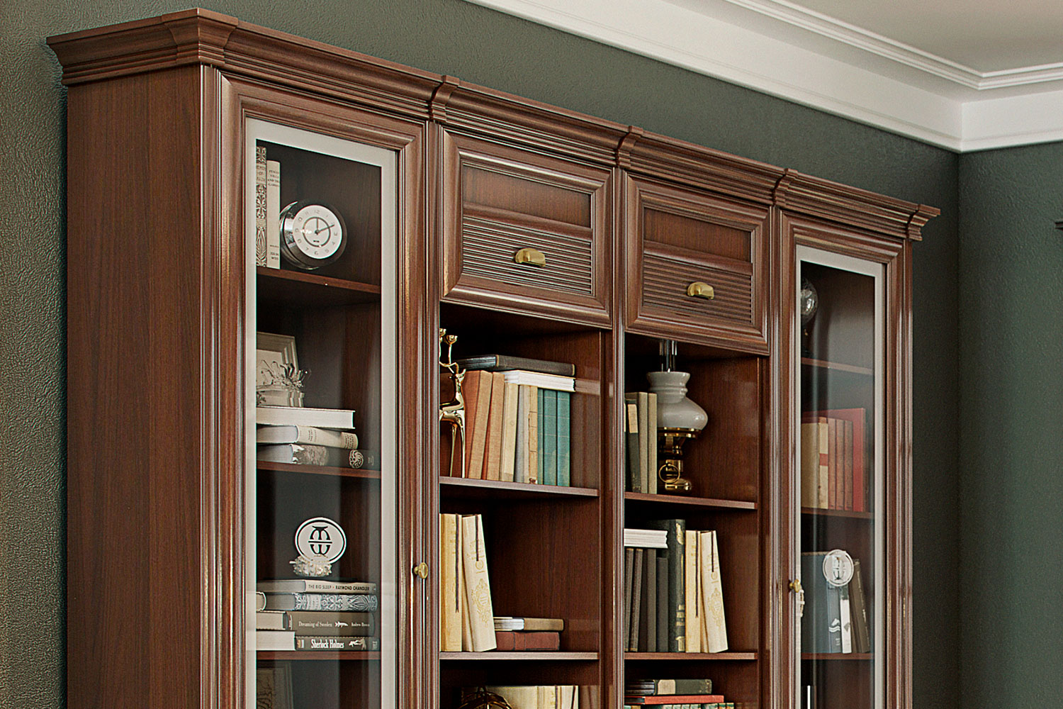 Респектабельный рабочий кабинет «Изотта 7» предназначен для тех, кто ценит классические формы, безупречное качество и изысканный дизайн. Высокие шкафы и письменный стол, несмотря на относительно небольшой вес, выглядят массивно и солидно благодаря карнизам, цоколям, завершающим колоннам и декоративной фрезеровке. Открытые центральные отсеки и рамочные фасады со стеклянными матовыми вставками визуально облегчают гарнитур.