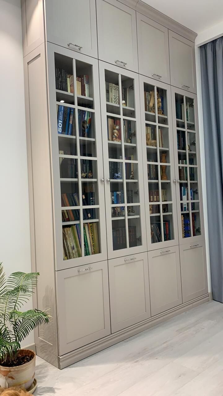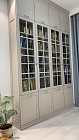 - Фасады: рамочной конструкции из профиля МДФ, окутанного бумагой с «финиш-эффектом», в «глухих» фасадах — вставки из ЛДСП 0,6 мм, в фасадах со стеклом — вставки из прозрачного стекла;