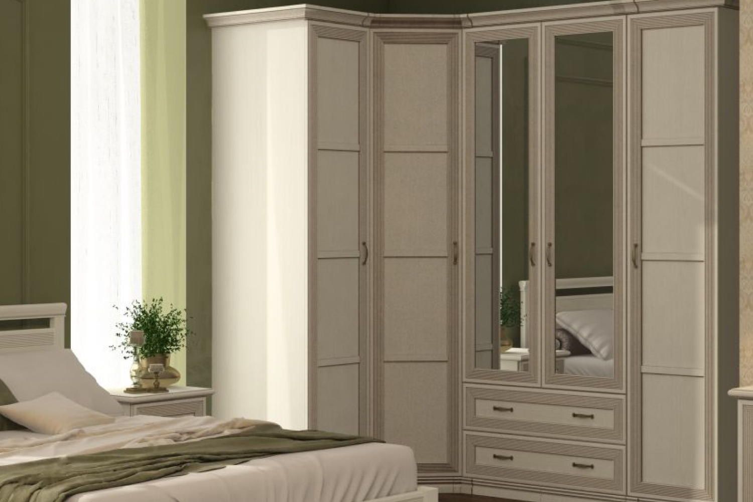 - Для хранения в спальне есть четыре удобных шкафа, один из которых с двумя зеркалами. Благодаря этому вы можете увидеть свой образ сразу после переодевания, не выходя в ванную или коридор;