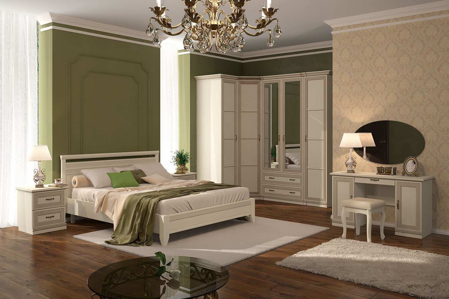 Чтобы сделать интерьер более завершенным, вы можете дополнительно приобрести металлические аксессуары в бронзовых оттенках и абстрактные постеры с яркими акцентами. Для большего удобства композицию можно завершить мягким пуфом или банкеткой в тон мебели. Конечно же, не забудьте про туалетный столик, который сделает утренние и вечерние ритуалы еще приятнее.