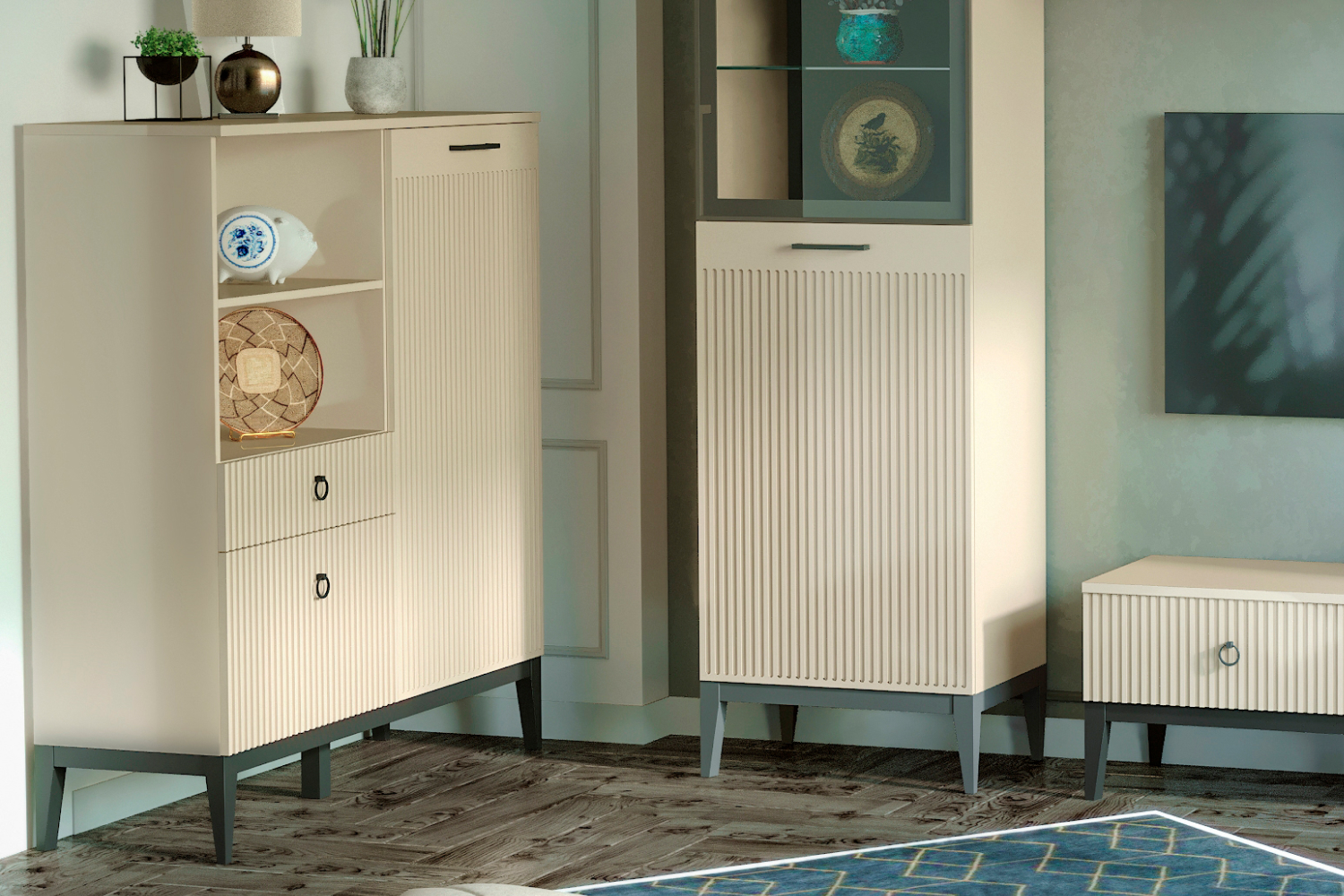 - Наполнение шкафа ХТ-270.04: полка в открытой части, три полки за высоким фасадом и 2 ящика (малый и большой);