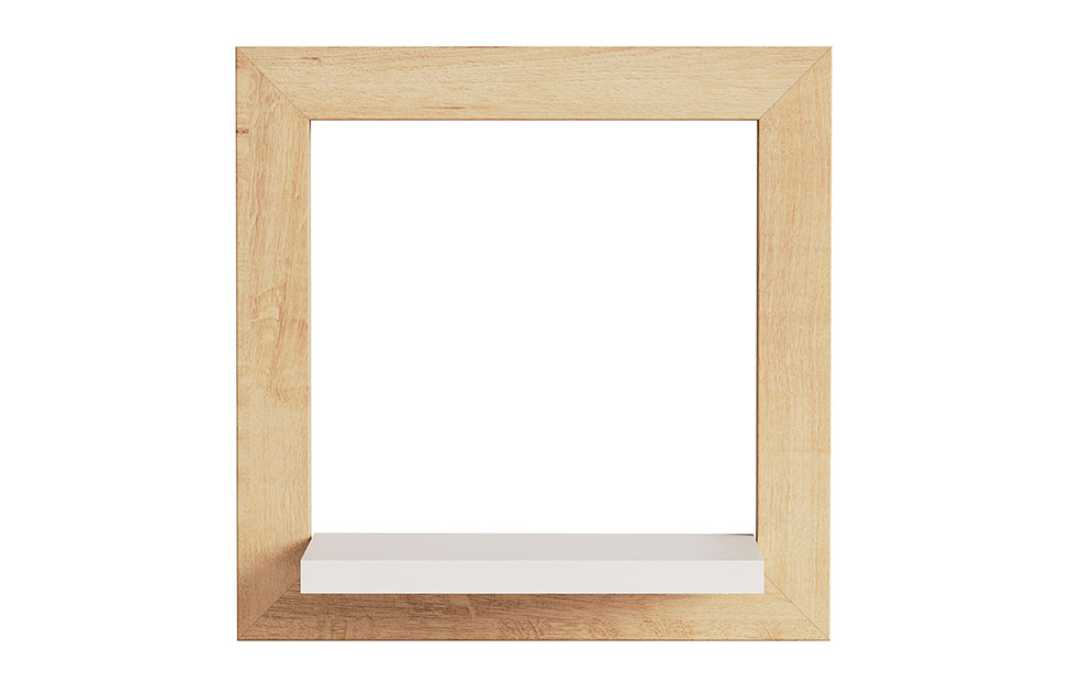 Актуальное цветовое решение — рамка белого цвета и текстурированная под «дуб бунратти» полка делает изделие подходящим для обстановки в стиле сканди или облегченный лофт. Модель фиксируется на стене-основании с помощью замаскированного менсолодержателя и навеса и выдерживает до 1-2 кг равномерно распределенного груза.