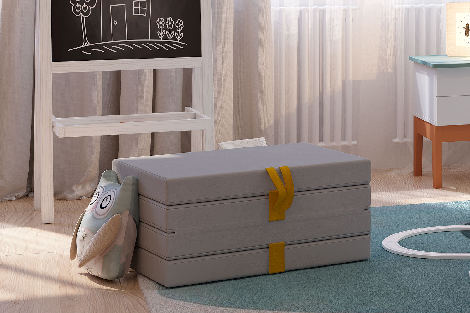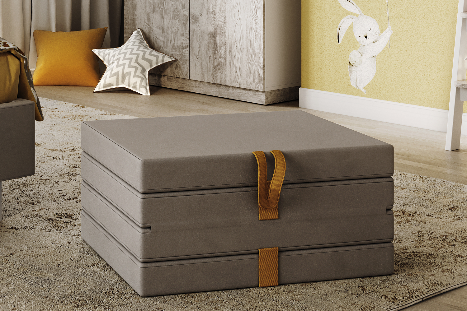 - Состоит из четырех мягких элементов, соединенных тканевой петлей, позволяющей трансформировать его в удобное спальное место (матрас), или в мягкое кресло-пуф;