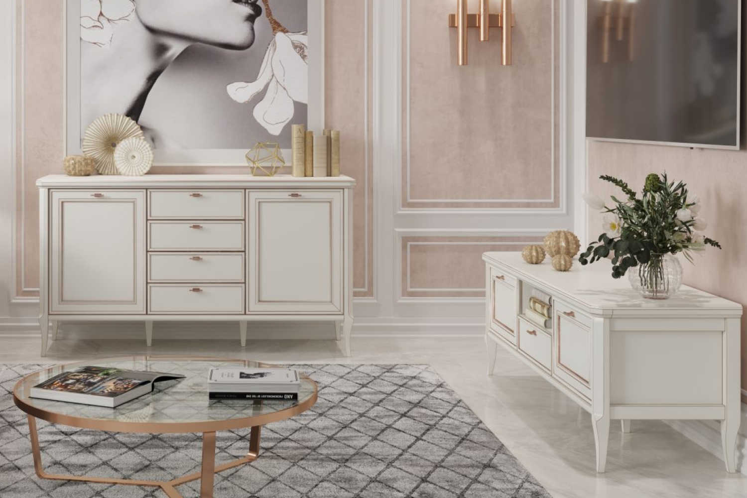 - Комод с тремя секциями: крайние секции комода — отделения с одной съемной щитовой полкой за распашными фасадами, средняя секция — выдвижные ящики;