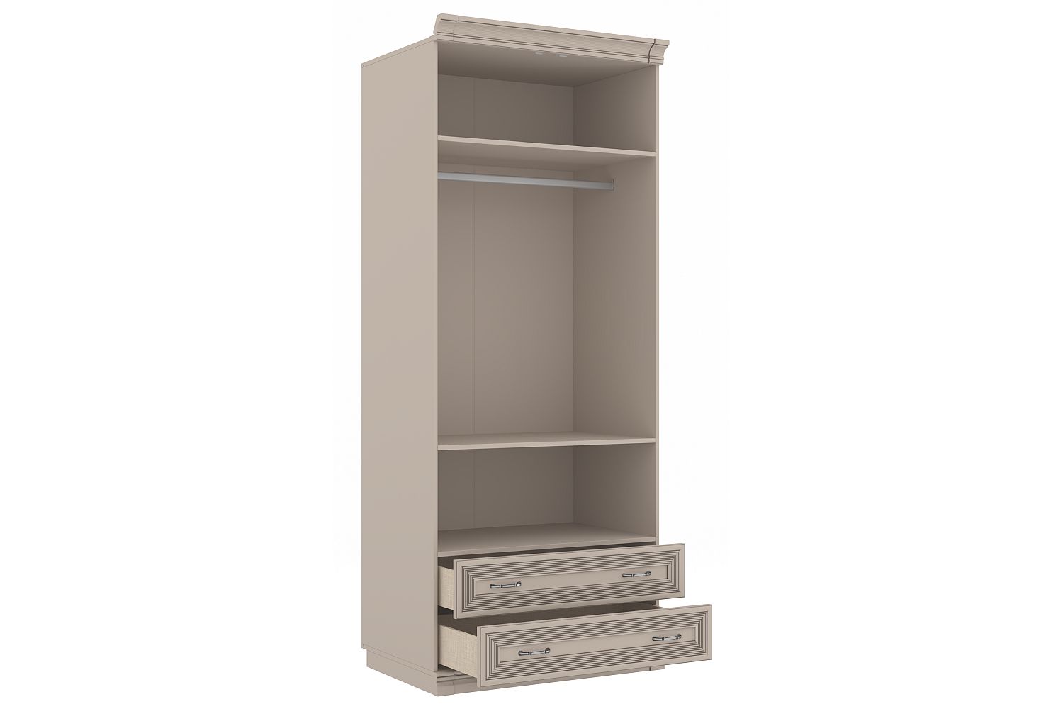 - Шкаф укомплектован полками, штангой и 2 выдвижными ящиками;