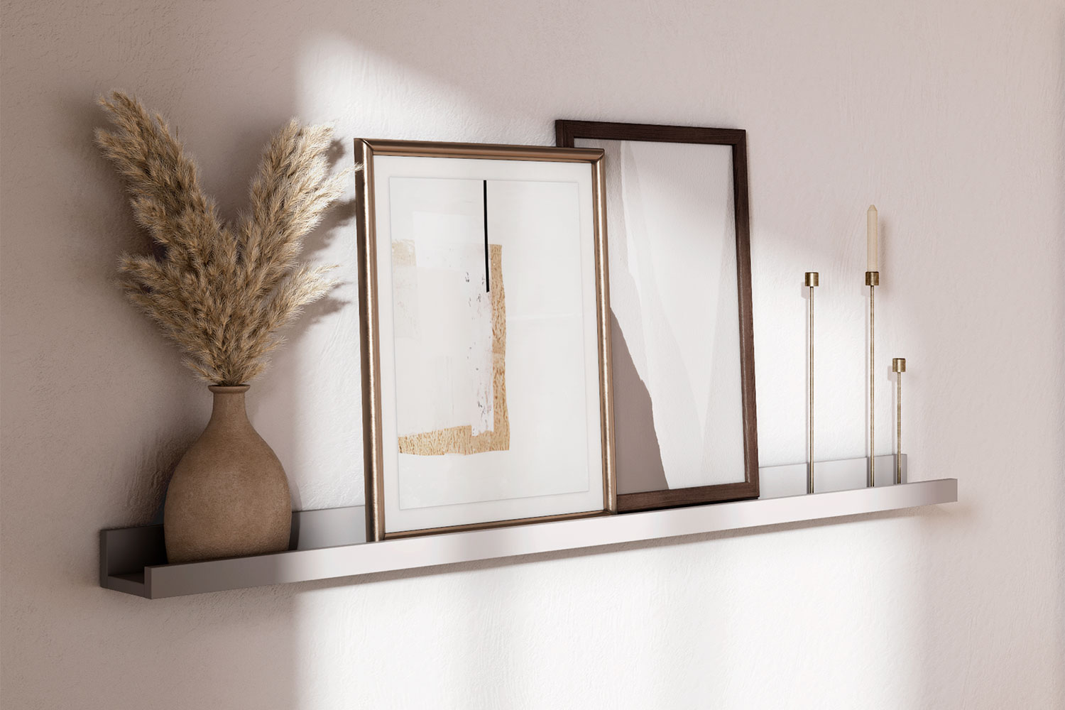 Полку можно использовать в композиции — комбинировать несколько вариантов размеров, чтобы создать настоящую галерею семейных фотографий или картин. Передний ограничительный профиль не даст соскользнуть предметам с полки.