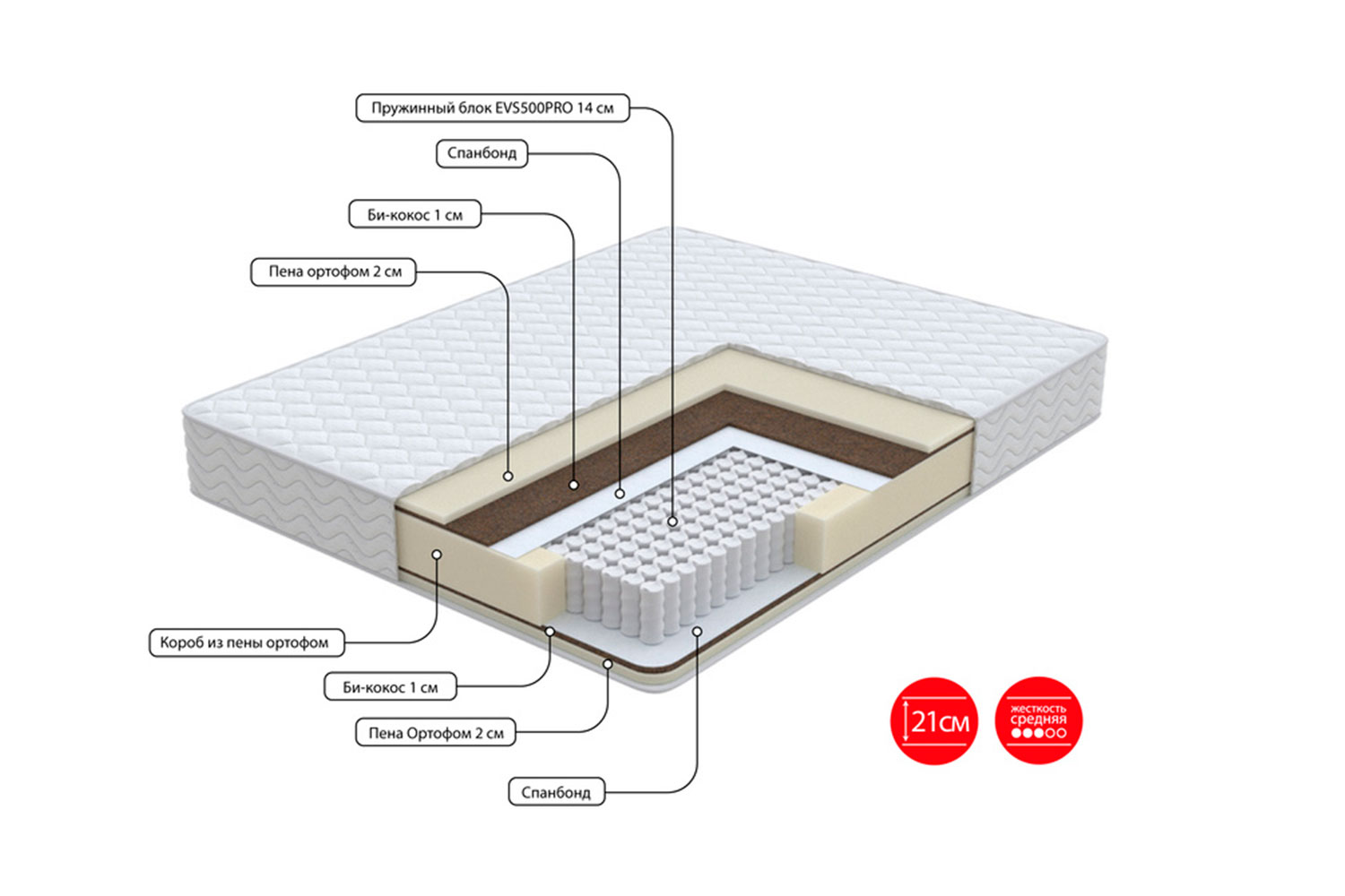 Матрас оптимальной средней жесткости на основе блока независимых пружин, который позволяет поддерживать тело в анатомически правильном положении для комфортного сна.