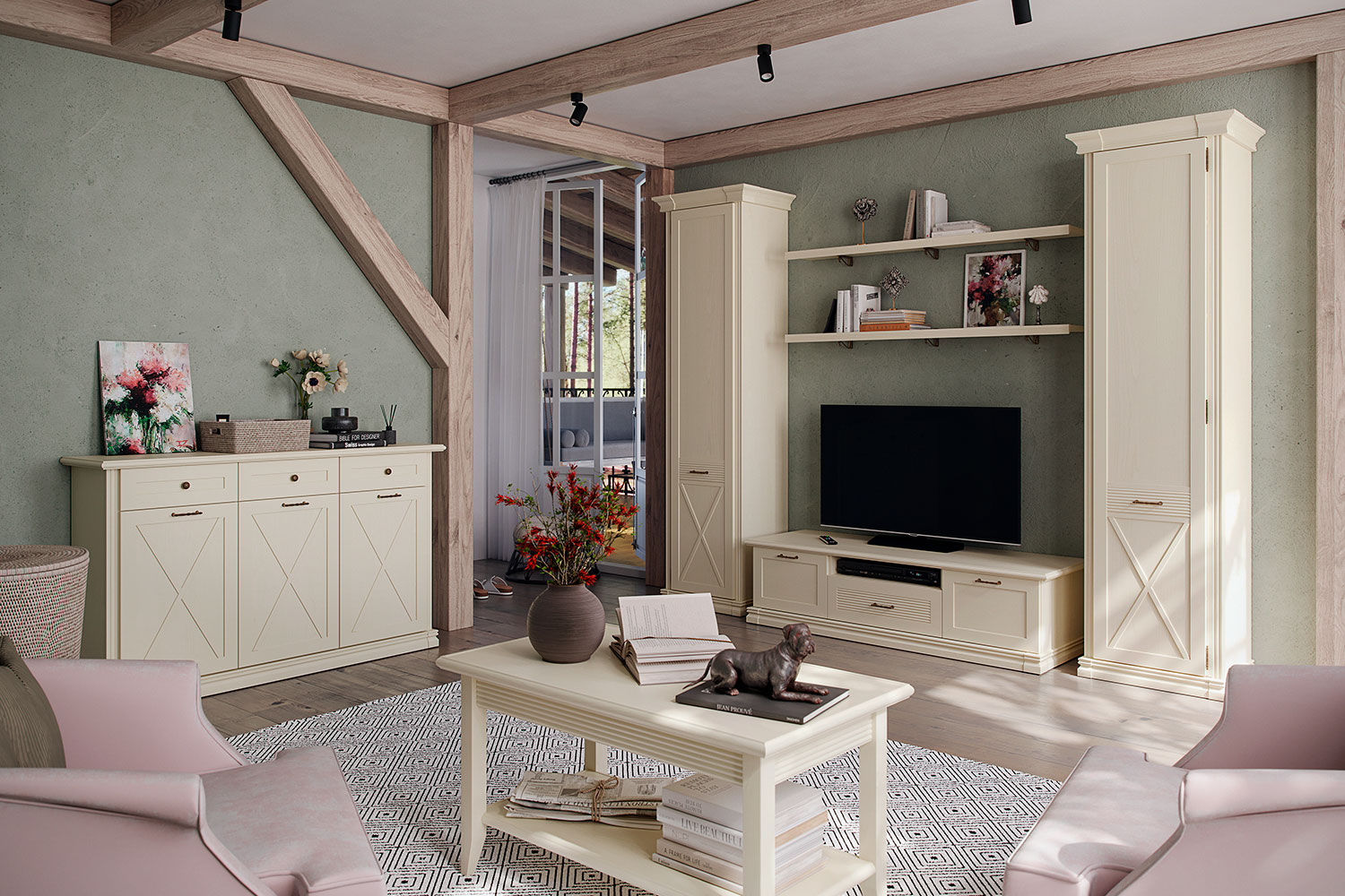 - Гостиная в классическом стиле. Кантри — одна из любимых коллекций наших клиентов. Такая мебель подойдет к интерьерам в стилях прованс, кантри или сканди. При создании этой коллекции наш дизайнер вдохновлялась самобытной архитектурой Германии с ее характерной фахверковой системой;