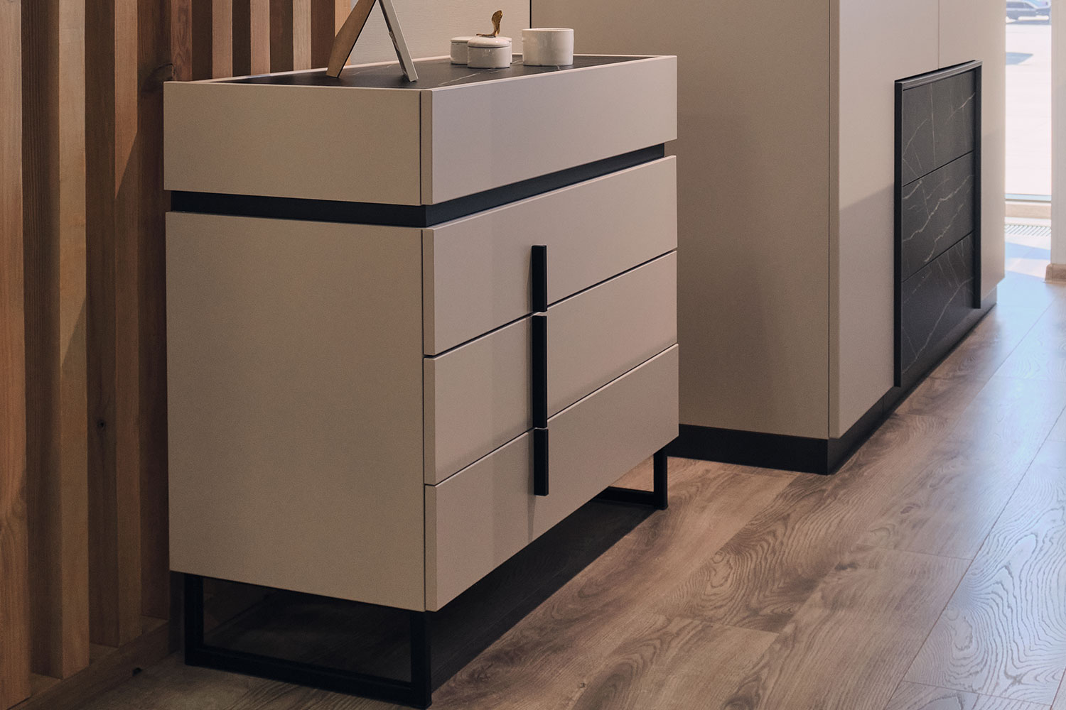 Все модули гармонично сочетаются друг с другом. Черный акцентный мрамор добавляет коллекции изысканности и роскоши, а выразительная геометрия тонких черных ручек на фасадах, перетекающая в линию опор, придают ей современный вид.