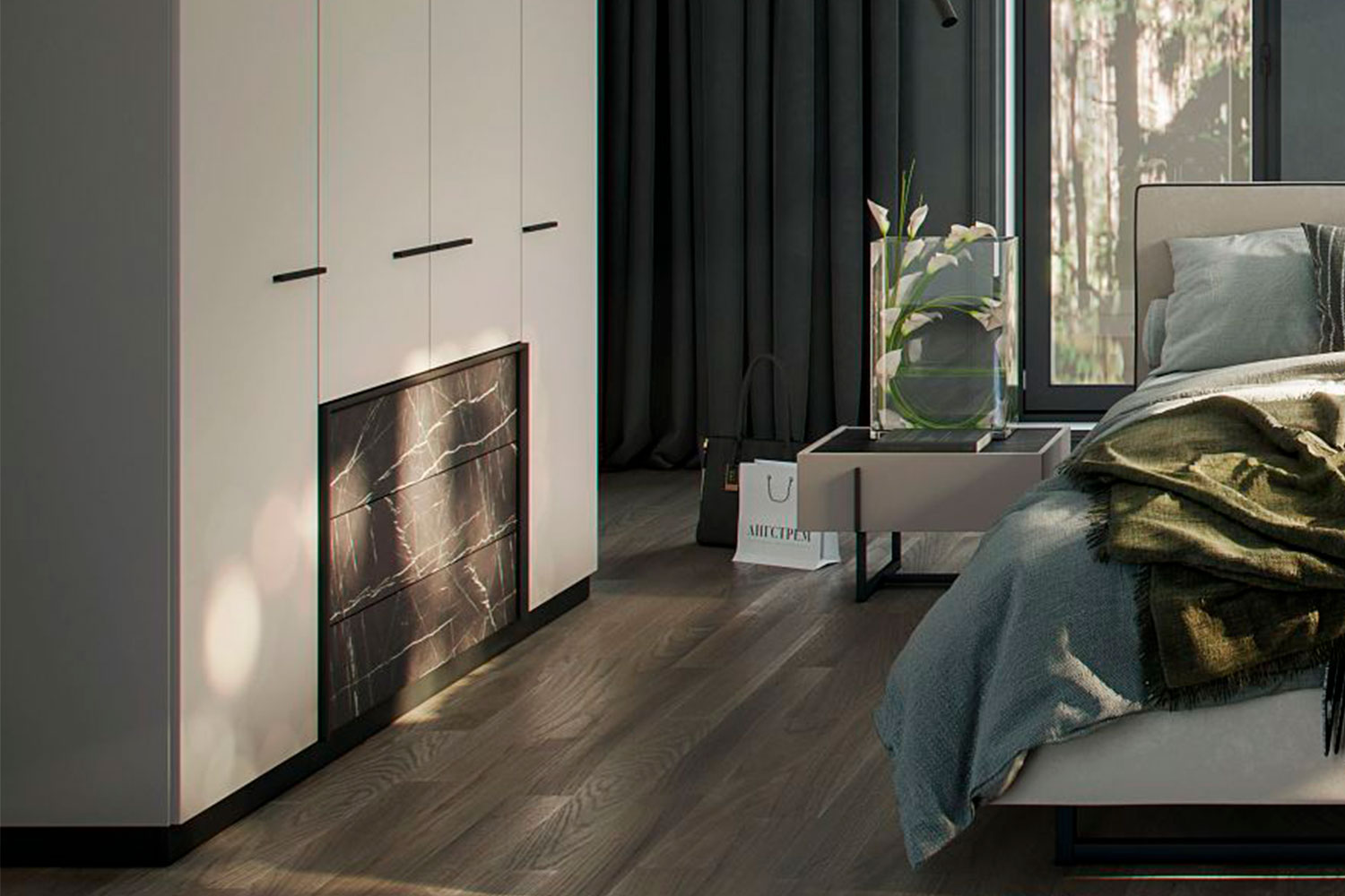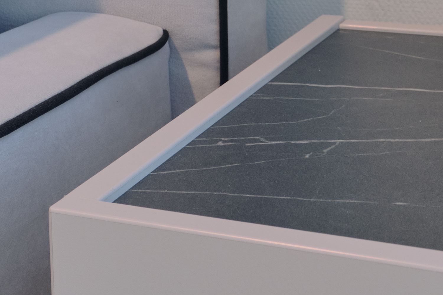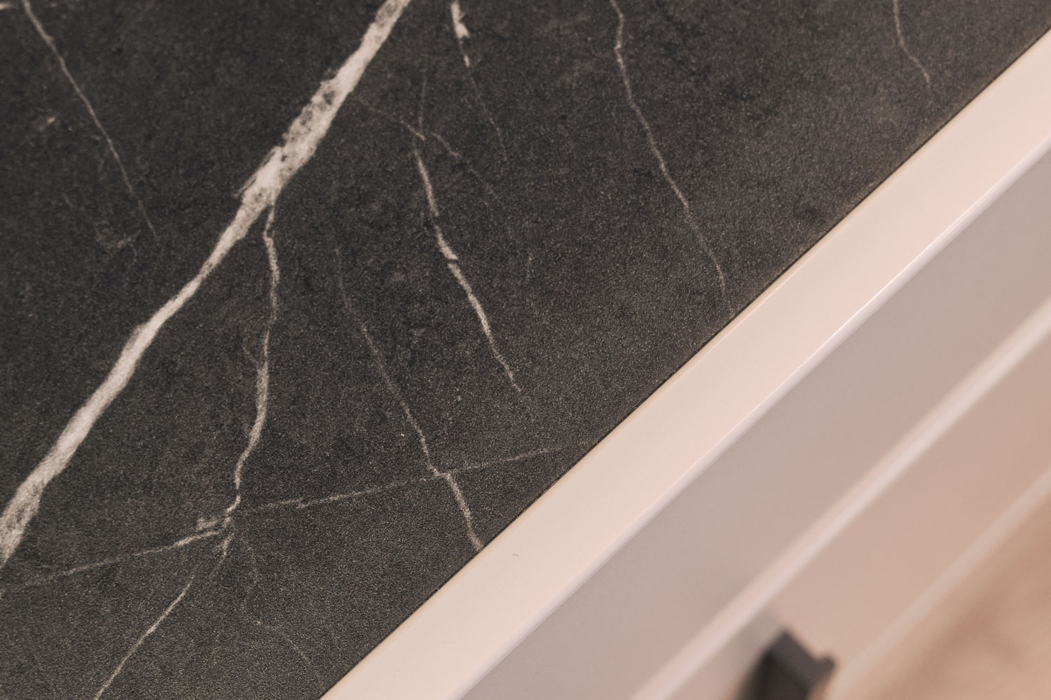 - Темные вставки на ящиках шкафа, столешницы тумб и комодов из ЛДСтП 16 мм черного цвета с имитацией рисунка мрамора;