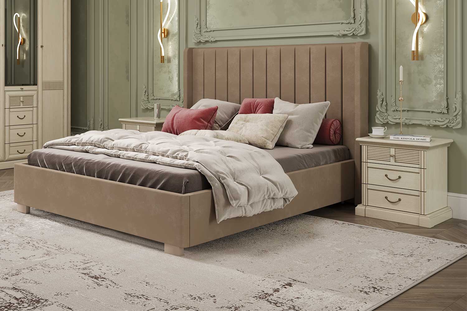 - Спальня Изотта понравится тем, кто ценит традиции и хочет подчеркнуть свой вкус и статус. С таким интерьером так и хочется проснуться пораньше, чтобы насладиться утренним кофе, новостями и спокойной, неспешной атмосферой вокруг, а приходить в спальню после тяжелого рабочего дня — настоящее удовольствие!
