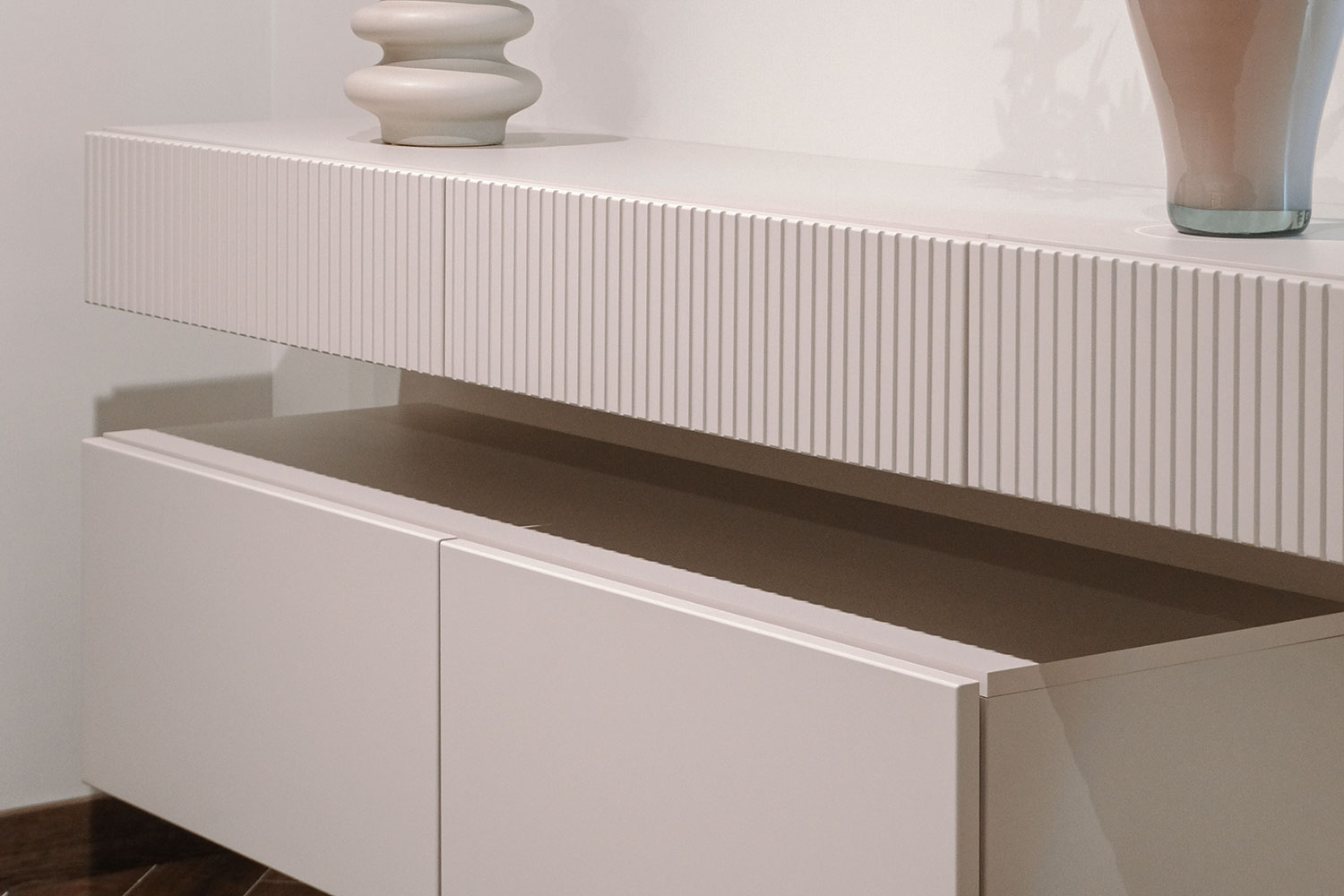 - Внимание! Открывание ящиков происходит путем захвата фасада снизу, поэтому нельзя навешивать вплотную снизу другие модули коллекции Дольче (открывание фасадов будет затруднительным).