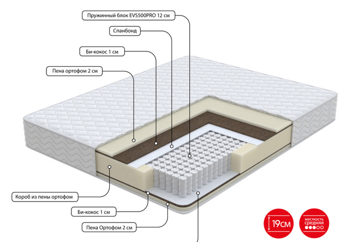 Матрас оптимальной средней жесткости на основе блока независимых пружин, который позволяет поддерживать тело в анатомически правильном положении для комфортного сна.