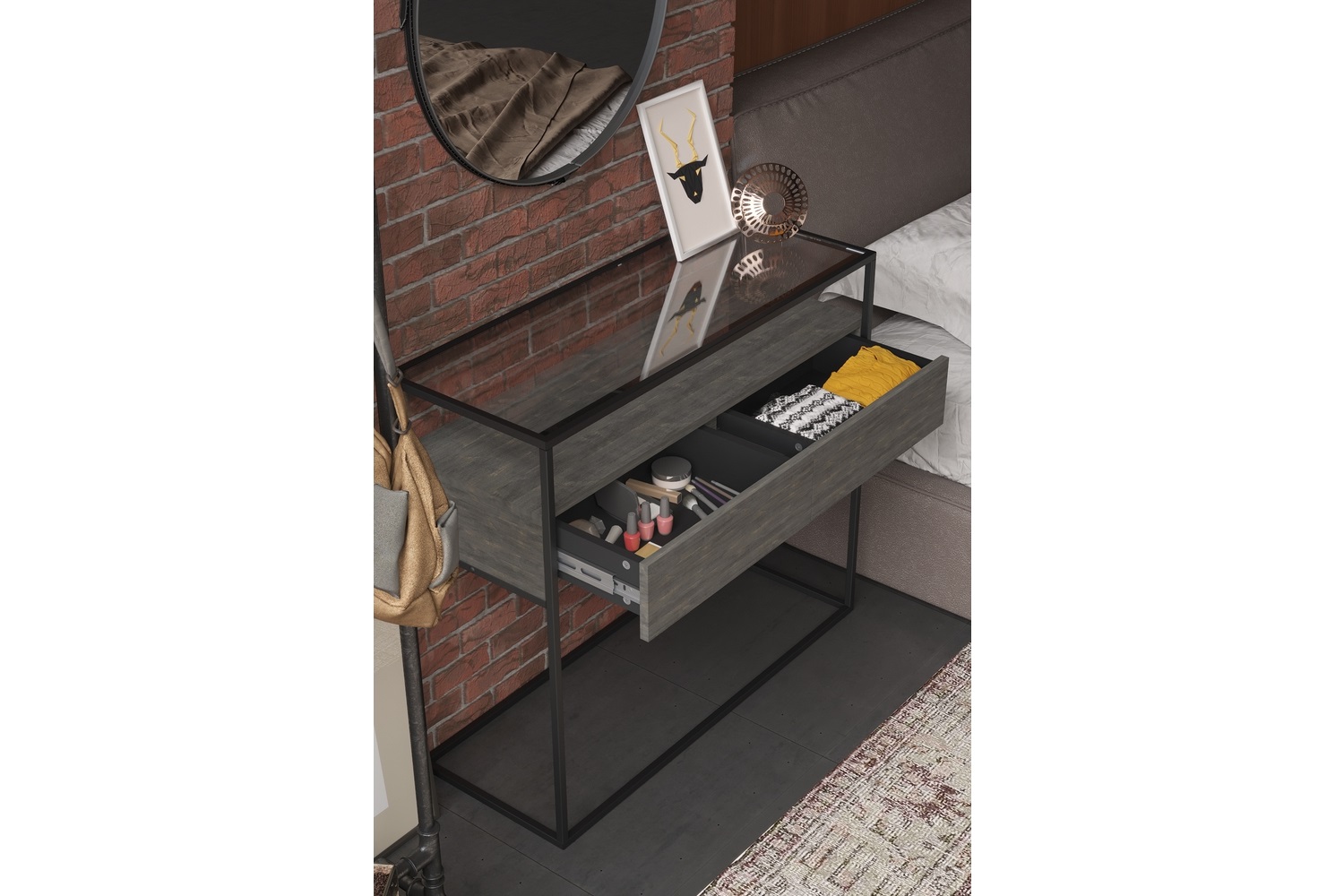 Консоль Эйд выполнена в современном лаконичном стиле и уместно дополнит интерьер спальной комнаты или прихожей. Стильная консоль приковывает внимание прежде всего своим исполнением: комбинацией используемых материалов. Стеклянная столешница из тонированного закаленного стекла в сером цвете дополнена полкой и ящиками для удобного хранения подручных вещей с системой открывания PUSH-TO-OPEN. А прочный металлический профиль толщиной 15 мм обеспечивает высокую прочность и устойчивость.
