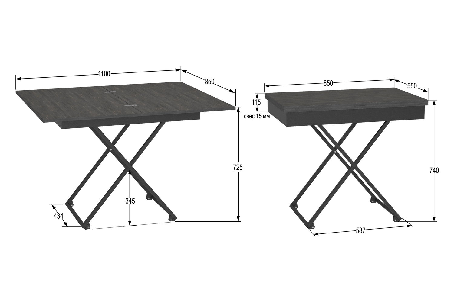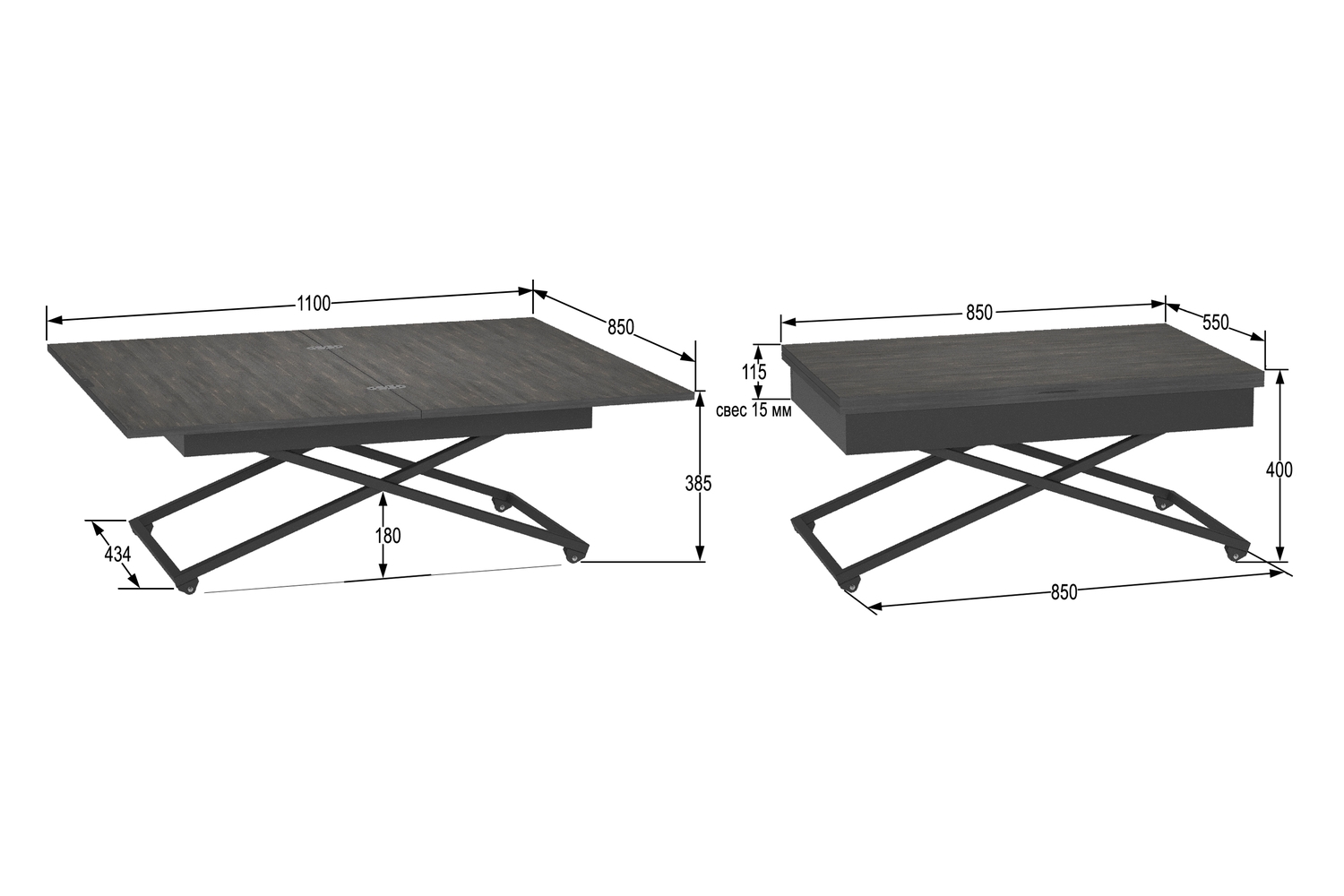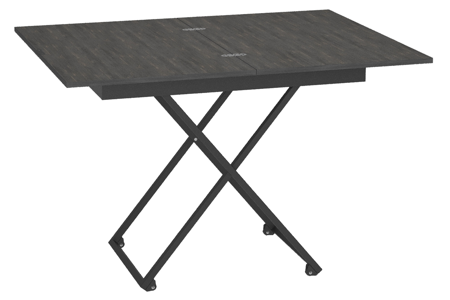 Размеры столешницы в сложенном состоянии 85 x 55 cм, в разложенном — 110 х 85 cм. По высоте стол имеет два положения (разложенный/сложенный): 38,5/40 см и 72,5/74 см. Ножки стола выполнены из прочного металлического профиля, столешница — из ЛДСП. Стол на прорезиненных роликовых опорах, что без труда позволит перемещать его в помещении, при этом не царапая и не повреждая напольное покрытие.