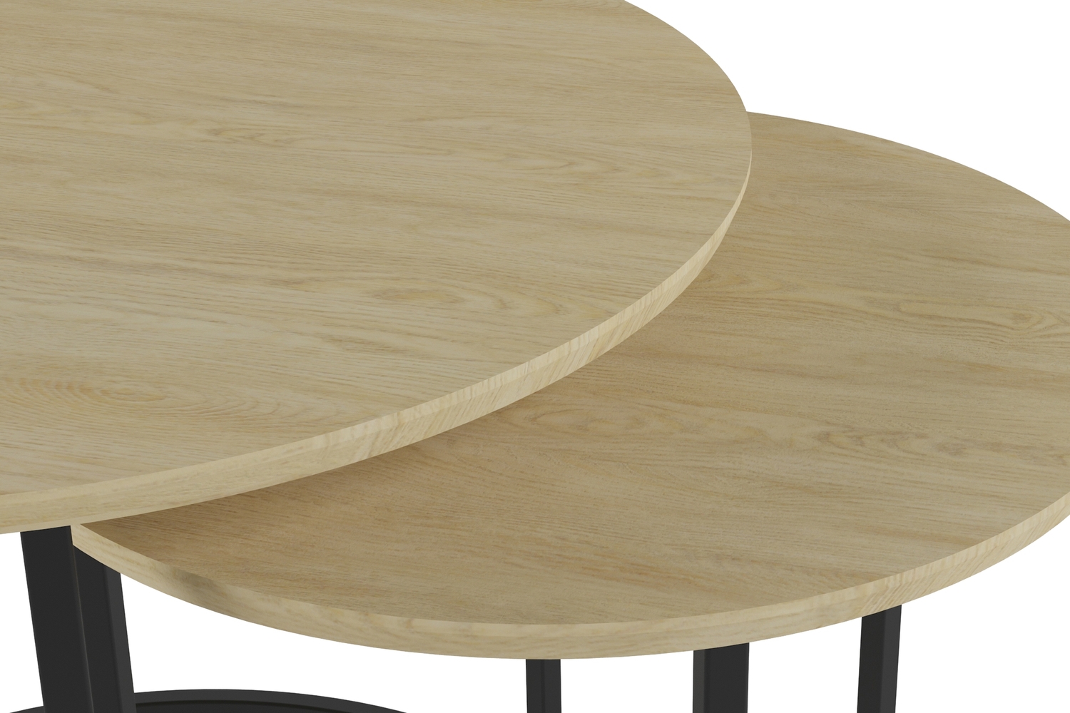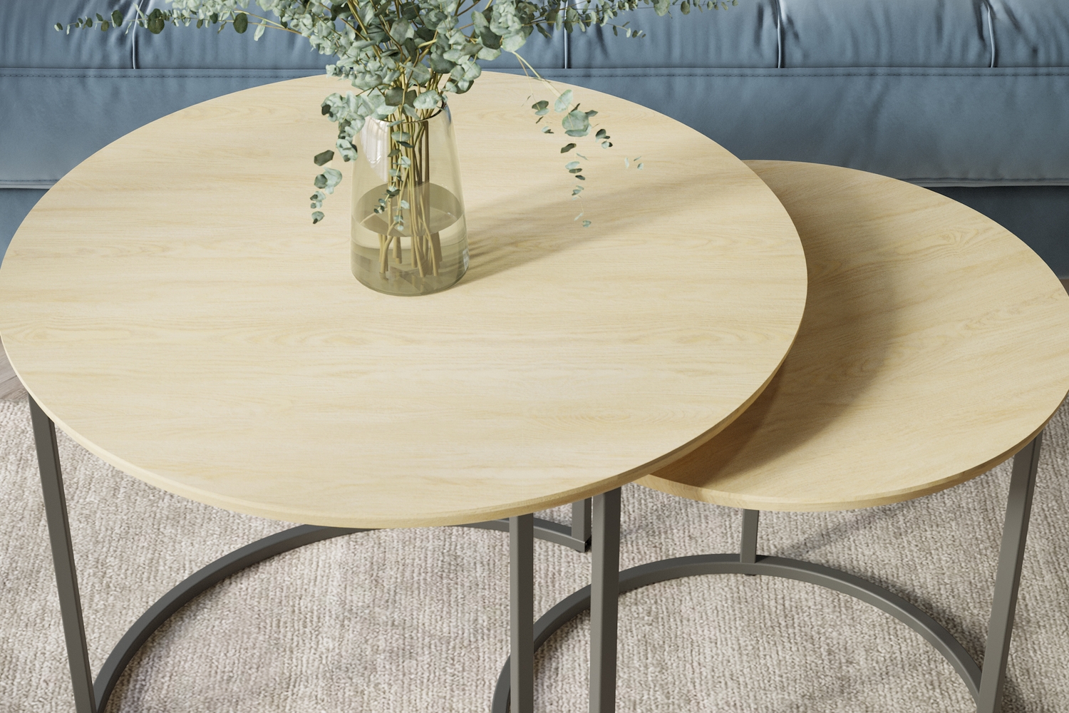 Комплект столов журнальных «Лесло» представляет собой гармоничную и функциональную композицию из двух столиков разной высоты и диаметра, расположенных один над другим. Дизайнерский прием — возможность разместить данную модель любым комфортным способом или использовать каждый из них по отдельности. Комплект журнальных столиков выполнен в стиле лофт, сочетающем оригинальную текстуру декоративного покрытия столешницы и металлического подстолья. Благодаря своей строгой элегантности и универсальности журнальные столики легко комбинируются с мебелью в современном стиле.