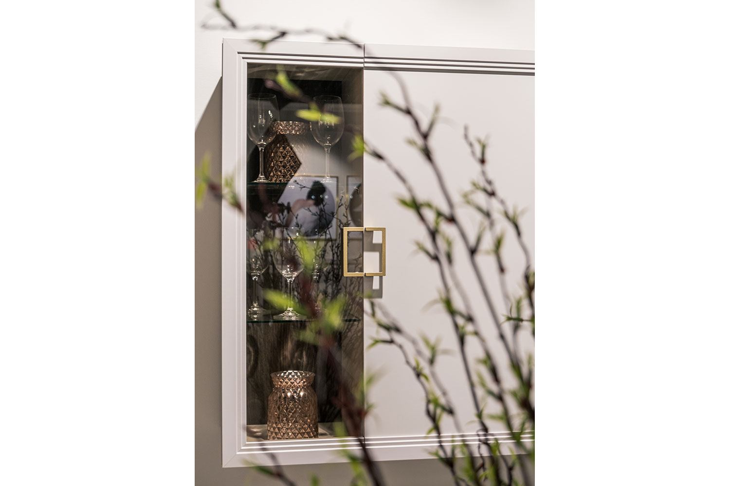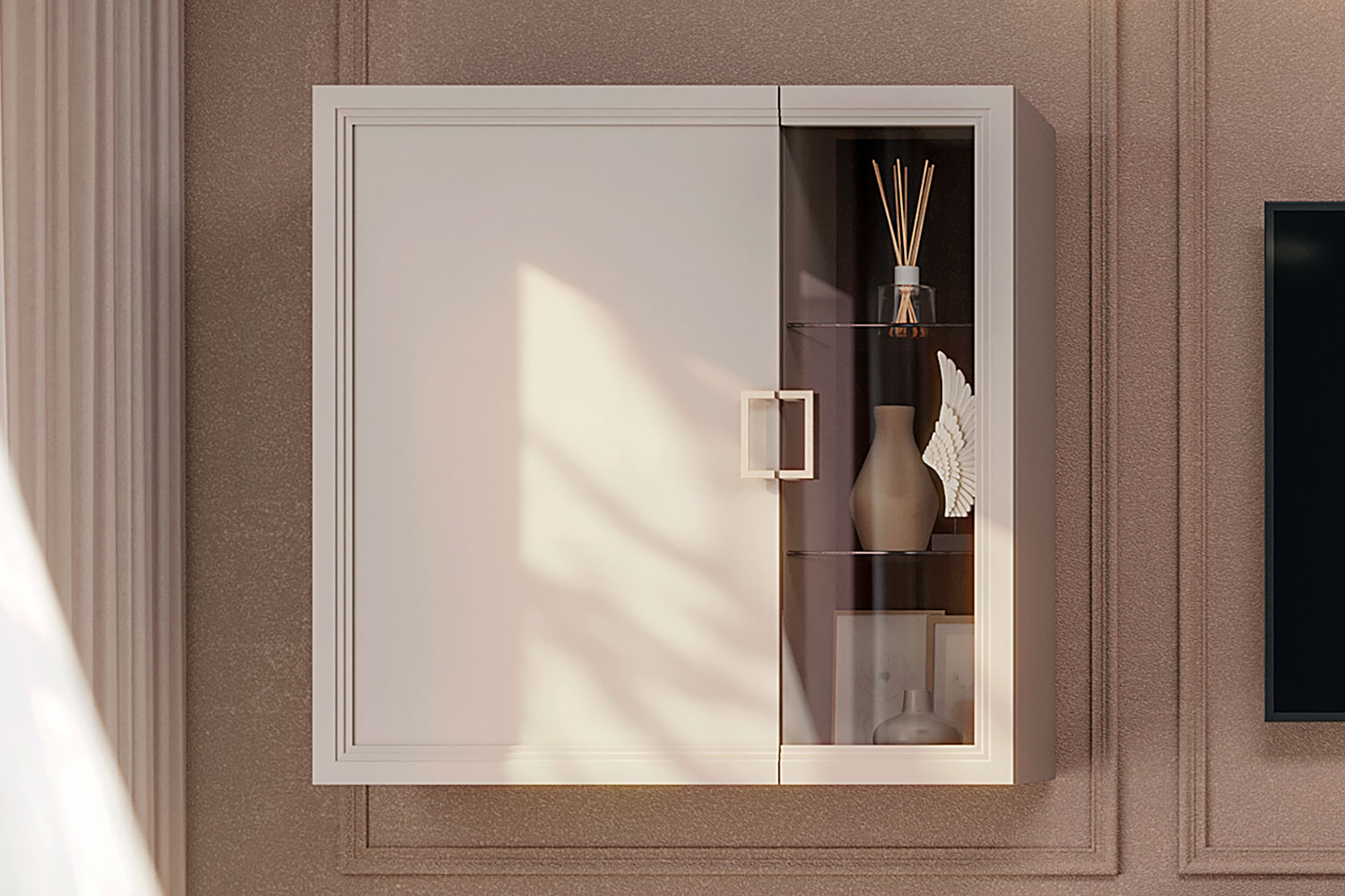 - Шкаф настенный с одним глухим фасадом и одним рамочным со вставкой стекло тонированное. Внутреннее наполнение: стеклополки 0,6 см за стеклянным фасадом и ЛДСП 1,6 см за глухим фасадом. Максимальная нагрузка (вес, размещенный внутри шкафа) — не более 30 кг, при этом на нижнюю крышку (нижнее отделение) нагрузка должна быть не более 3 кг (нагрузка зависит от крепления к стене и материала стены);