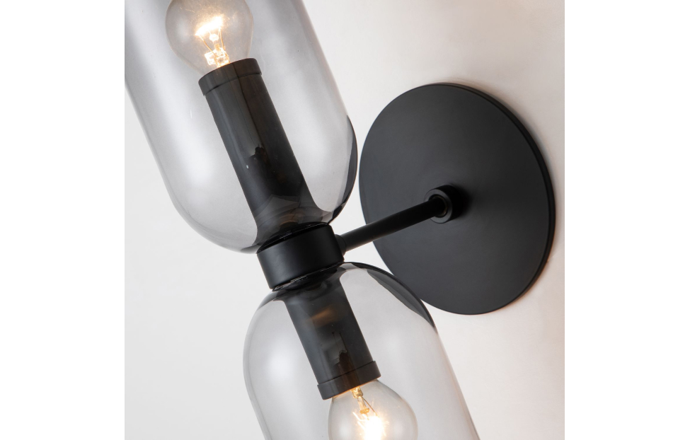 Настенный светильник коллекции Amusing с серыми зеркальными плафонами и чёрным каркасом. Двойные плафоны оригинальной формы и разной высоты хорошо рассеивают свет ламп, направленных вверх и вниз. Чёрная коллекция станет красивым дополнением к современному интерьеру и интерьеру в стиле лофт.