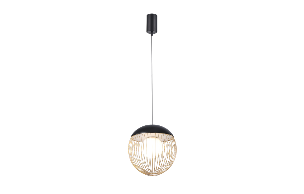 Коллекция Core — это гармоничное сочетание прочности металла и нежности стеклянных плафонов. Стеклянный выдувной плафон заключен в проволочный каркас из тонких, спаянных между собой металлических трубочек, создавая эффект золотой клетки, защищающей светящийся шар. Подвес диаметром 30 см, стеклянный выдувной плафон заключен в проволочный каркас из тонких, спаянных между собой металлических трубочек, каркас в черном цвете с золотым, модуль LED, регулируемая высота.