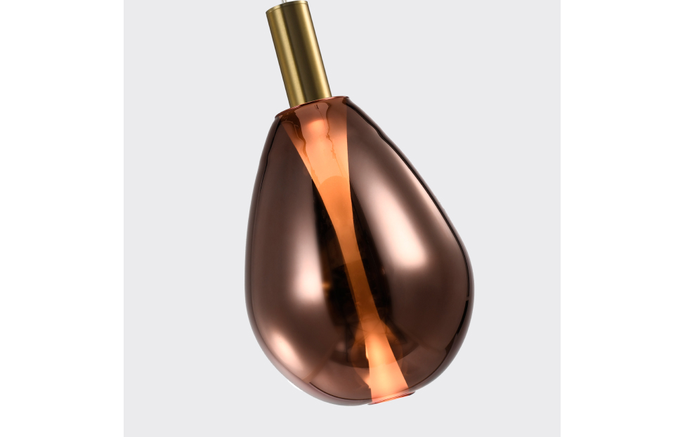 Особенностью подвесов Hopper является декоративный элемент в центре, формируемый в процессе выдувки стекла, который создает сложную и интересную форму плафона, становится основой его неповторимого облика. Плафон подсвечивается изнутри светодиодным источником света, создавая эмоциональное волнующее освещение. Подвес с каркасом в цвете латунь, с плафоном в медном цвете, регулируемая высота.