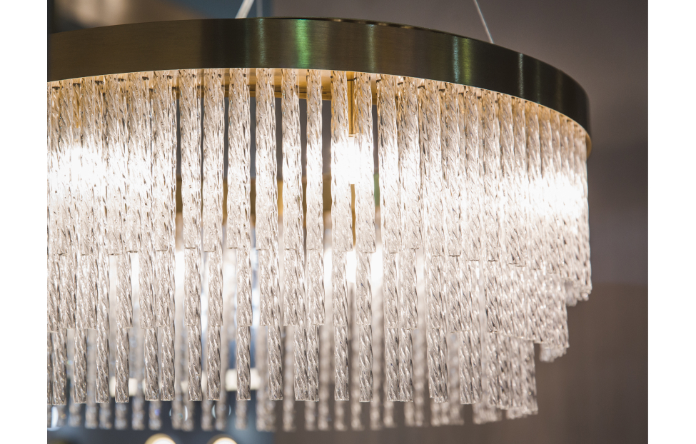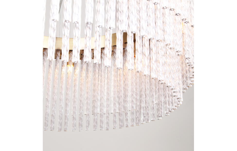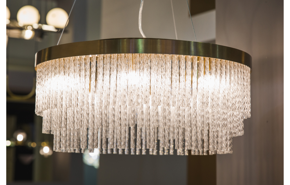 Коллекция Bellinda выполнена в стиле американской классики. Каскадная конструкция состоит из закрученных вокруг своей оси стеклянных трубочек. Этот декор скрывает лампы и мягко пропускает свет. Цвет латуни придает люстрам изысканный вид. Крепление на струнах позволяет регулировать высоту подвеса.