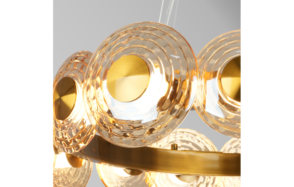 В основе дизайна светильников Claros лежат стеклянные закругленные фактурные плафоны, напоминающие изящные тарелки, между которыми встроены модули LED, создающие мягкое и комфортное освещение. Коллекция включает в себя одиночные подвесы, люстры, а также два вида настенных светильников, что позволяет создавать комплексное освещение пространства в едином стиле. Люстры можно легко комбинировать в оригинальные световые композиции, используя универсальные крепления, что дает простор для творческих решений и индивидуального подхода к оформлению интерьера. Металлический каркас цвета латунь, закругленный фактурный плафон из прозрачного стекла, регулируемая высота, LED-модуль.