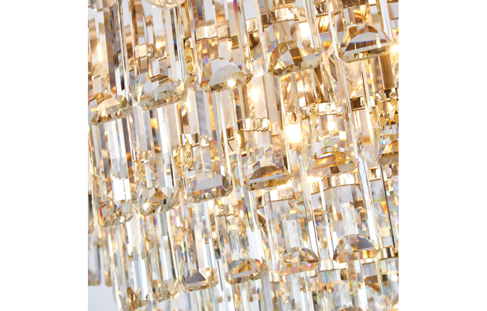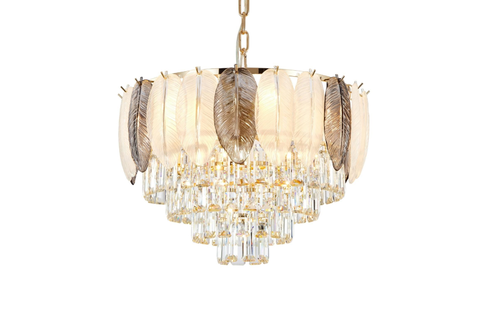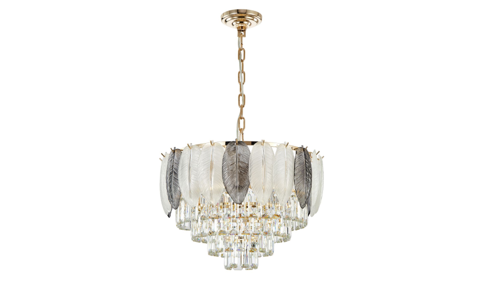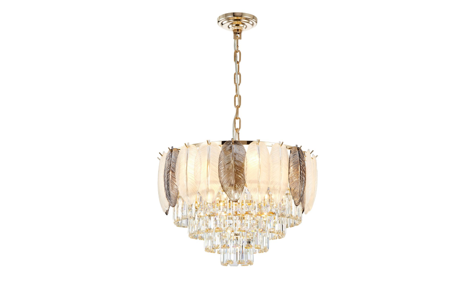 Отображение природных мотивов в предметах интерьера всегда выглядит утонченно и изящно. Это можно сказать и о нашей коллекции Dolor. Каркас коллекции в цвете золота оформлен декоративными лепестками из белого и серого стекла, которые обрамляют хрустальный водопад кристаллов высшего качества прямоугольной формы.