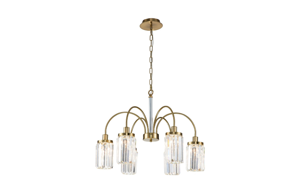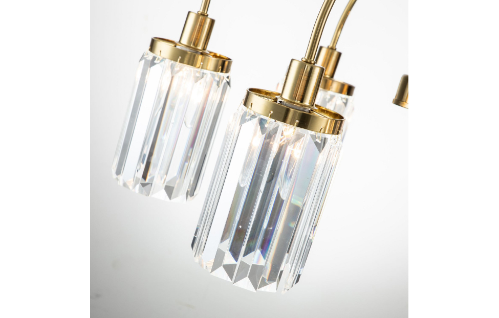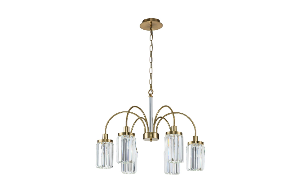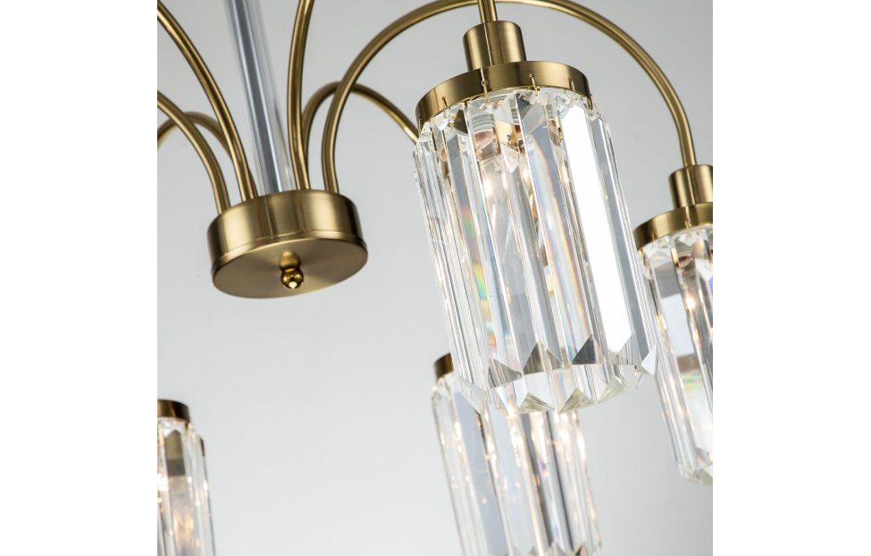Duke – коллекция в современном стиле. Рожки изысканной формы, напоминающей струи фонтана, покрыты золотой гальваникой и декорированы хрустальными подвесками прямоугольной формы, которые красиво преломляют свет ламп. Центральный шток украшен стеклянным цилиндром.