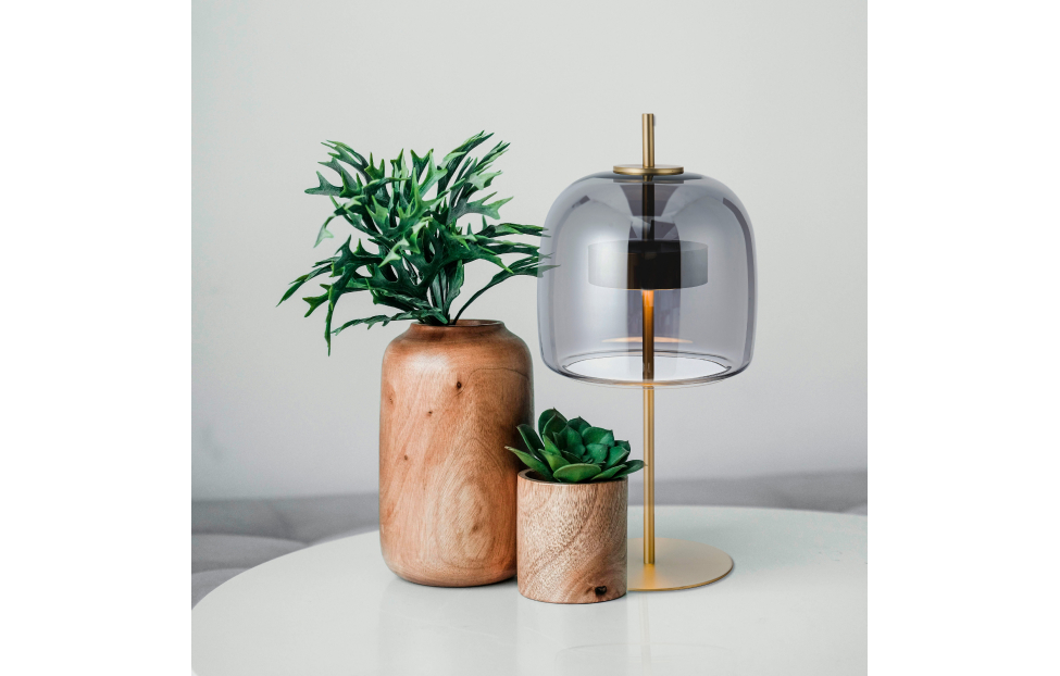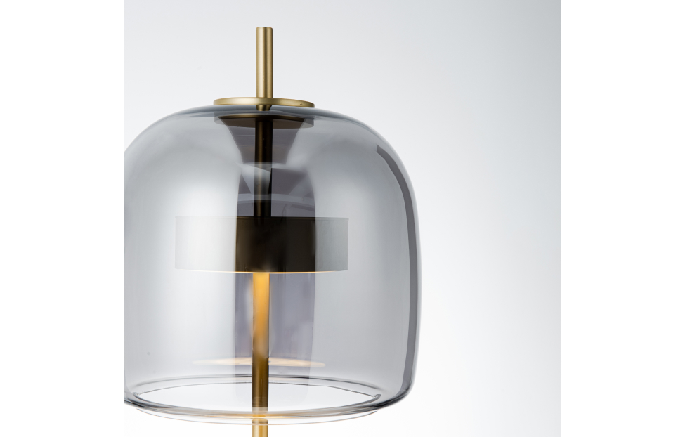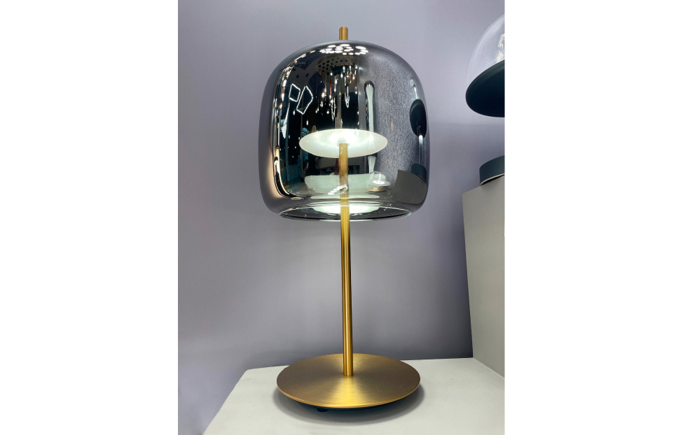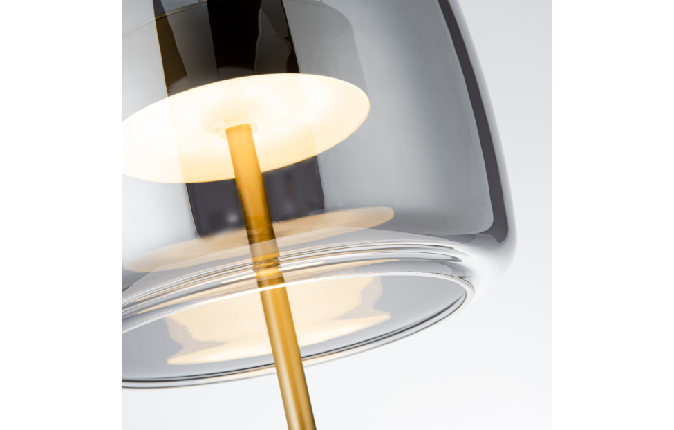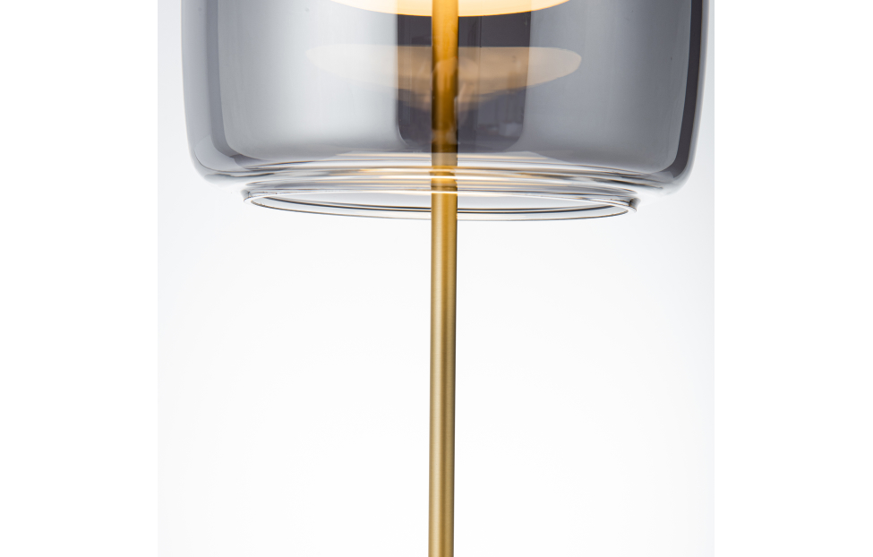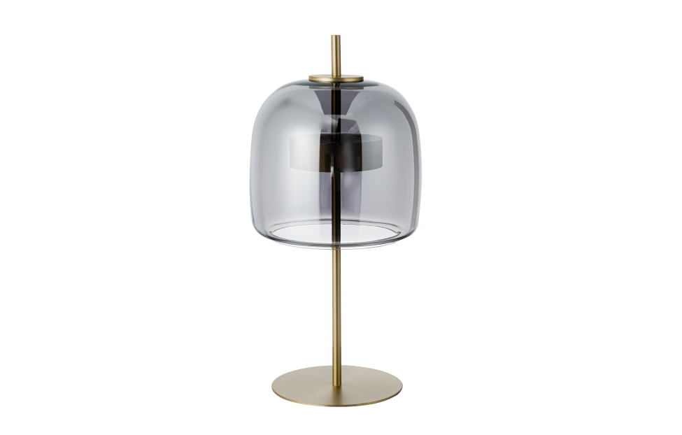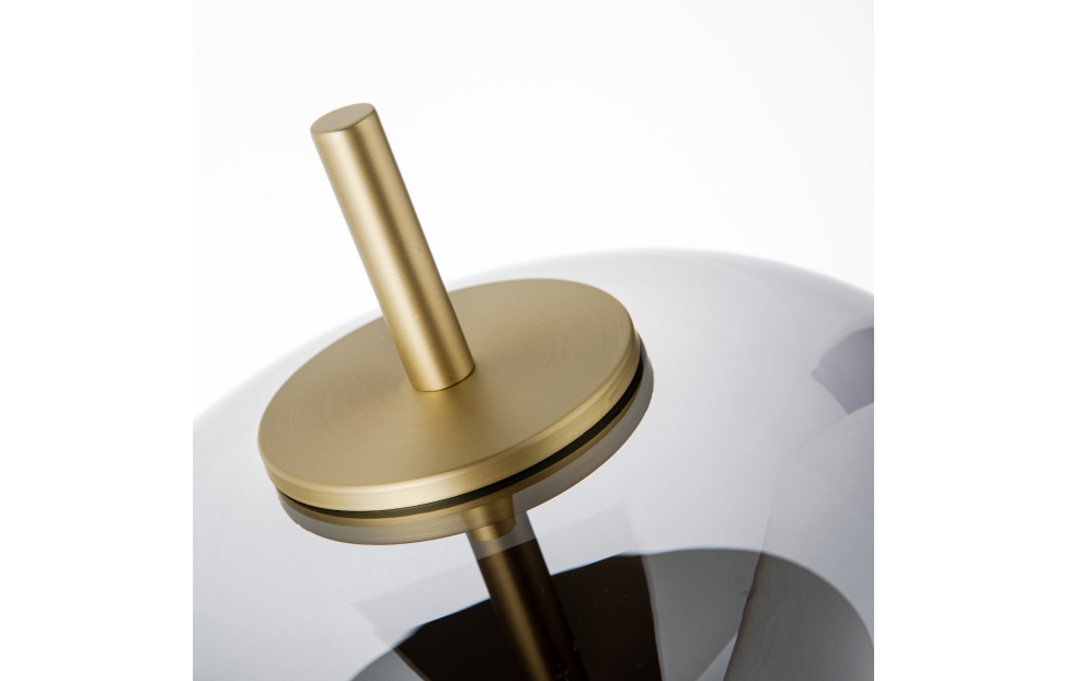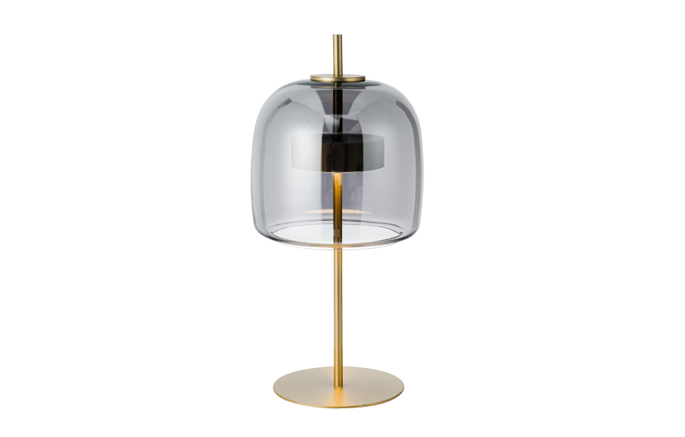 Внешний плафон необычной формы выполнен из выдувного стекла ручной работы. Настольная лампа с каркасом в цвете золото, плафон из дымчато-серого выдувного стекла со встроенным модулем LED.