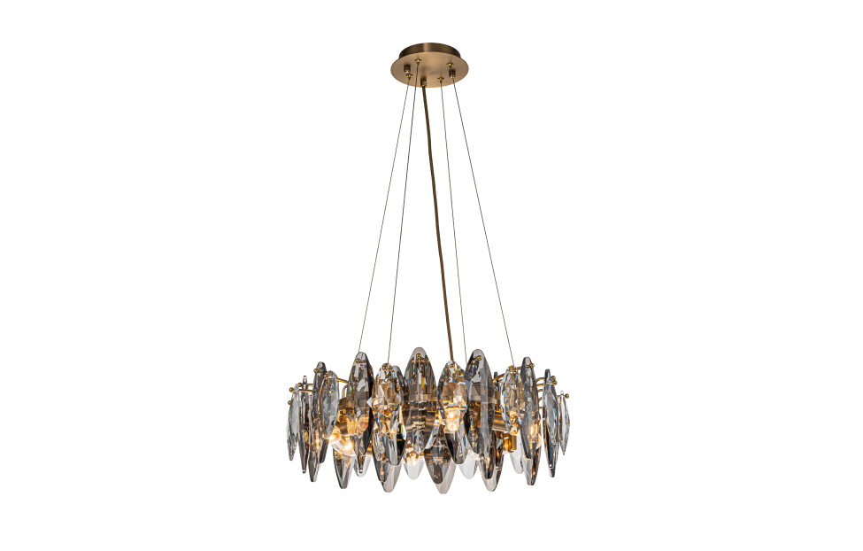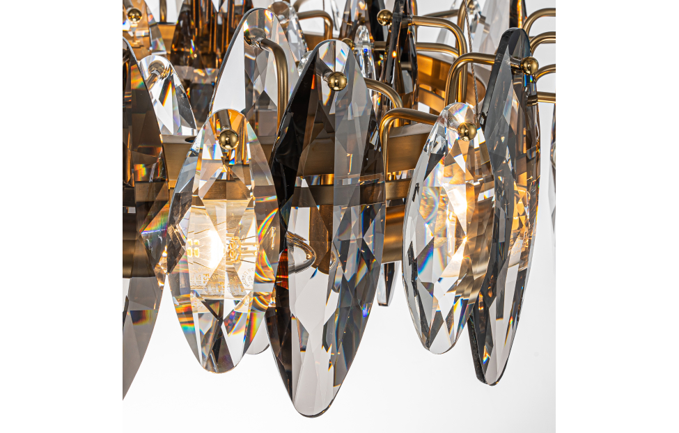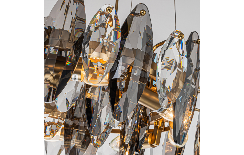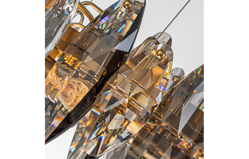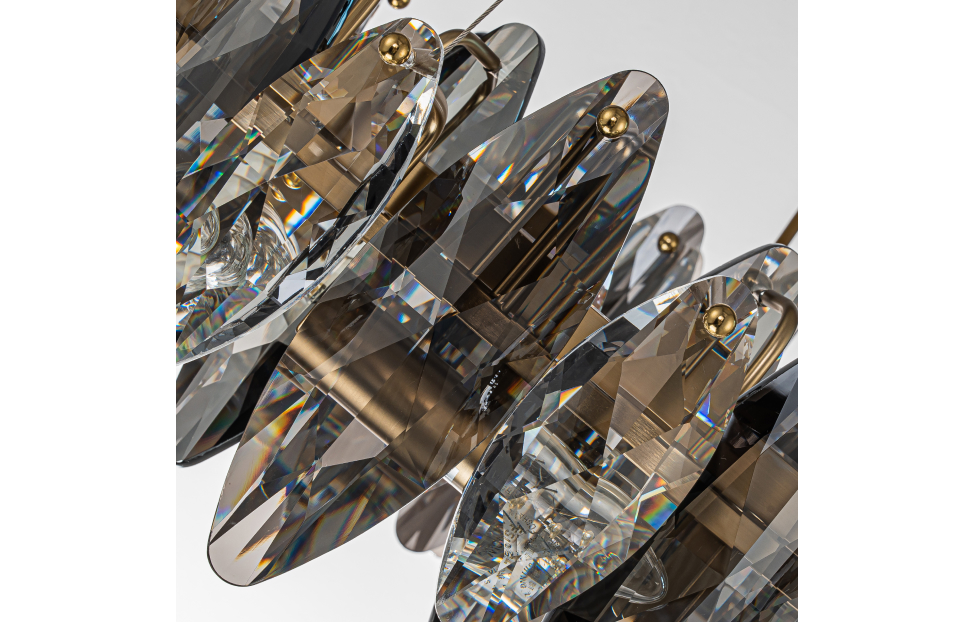 Glans – элегантная кольцевая коллекция, в которой используется прозрачный и серебристо-дымчатый хрусталь в ритмичном чередовании. Металлическая арматура светильника скрыта за хрустальными лепестками, создавая ощущение легкости и невесомости. К этой серии подходят универсальные крепления с помощью которых можно создать кольцевые композиции из нескольких люстр. Подвесная кольцевая люстра диаметром 50 см, каркас в бронзовом цвете, лепестки прозрачного и дымчато-серого хрусталя разного размера, цоколь E14, регулируемая высота