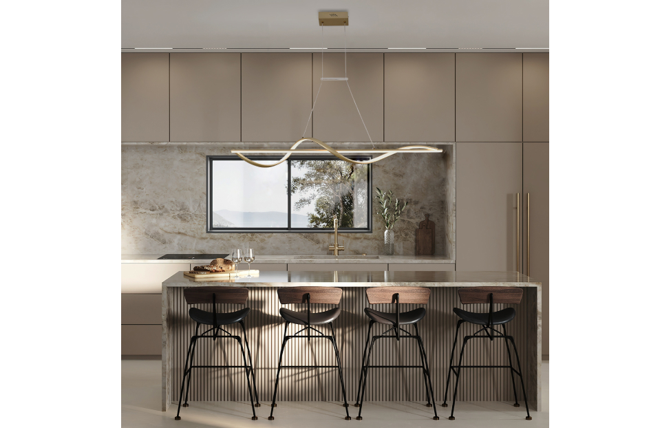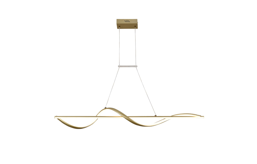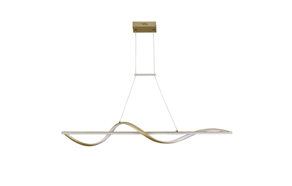 Подвесная люстра Locket представлена в цвете матовое золото. Вытянутый жесткий профиль со встроенной LED-лентой декорирован гибким профилем, который тоже оснащен LED-лентой и мягкой волной оборачивается вокруг жесткого профиля. Также внимание привлекает перемычка, которая связывает провода в параллель, дополнительно придавая изысканность этим светильникам. Светильники оснащены пультом дистанционного управления, который позволяет менять как мощность так и цветопередачу светильников.