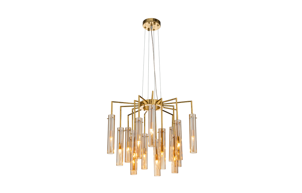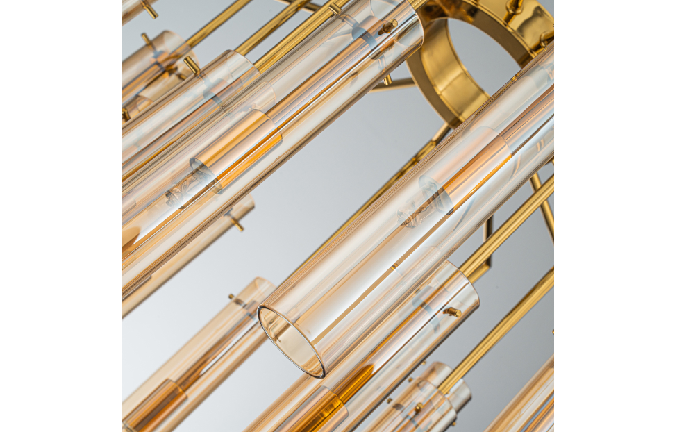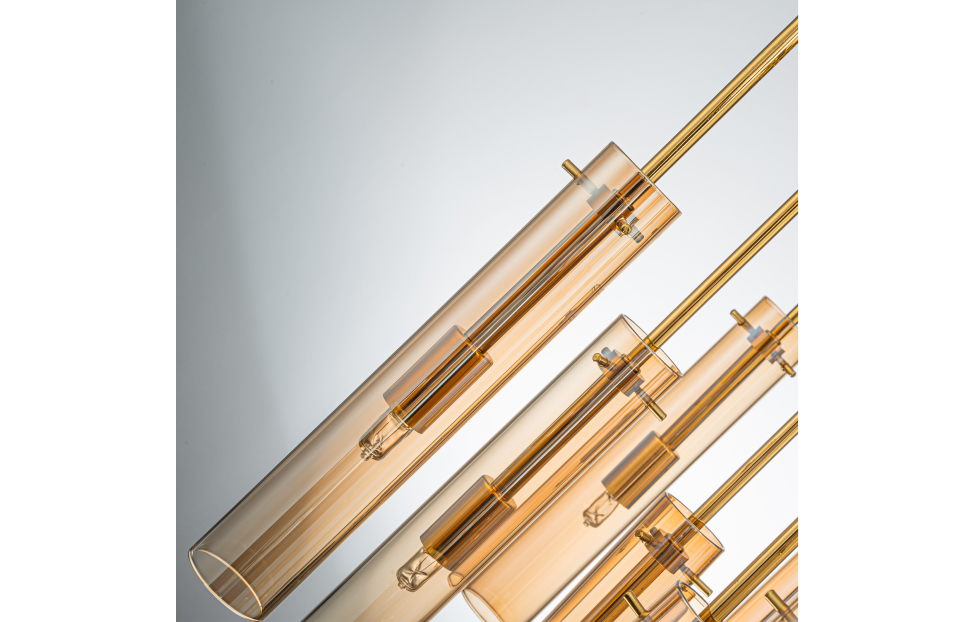 Каскадная люстра Orgel, каркас в цвете золото, состоит из металлических трубок, изогнутых от центрального кольца под прямым углом, на конце каждой трубки расположен тонкий длинный плафон из стекла янтарного цвета. сменная лампа G9, регулируемая высота.