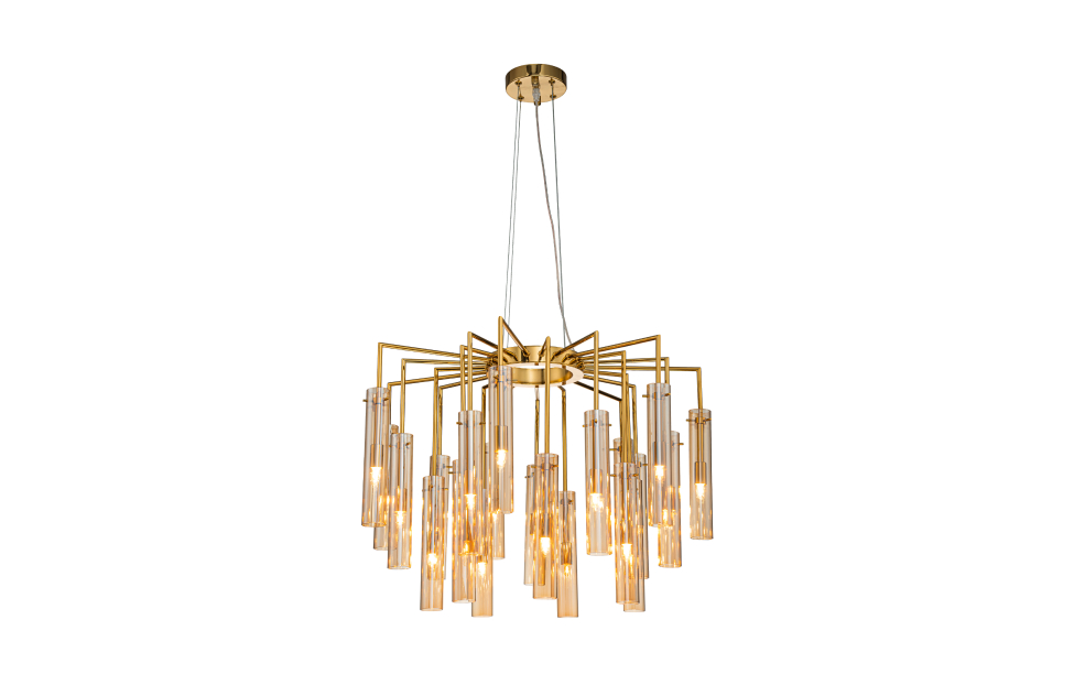 Каскадная люстра Orgel, каркас в цвете золото, состоит из металлических трубок, изогнутых от центрального кольца под прямым углом, на конце каждой трубки расположен тонкий длинный плафон из стекла янтарного цвета, сменная лампа G9, регулируемая высота.